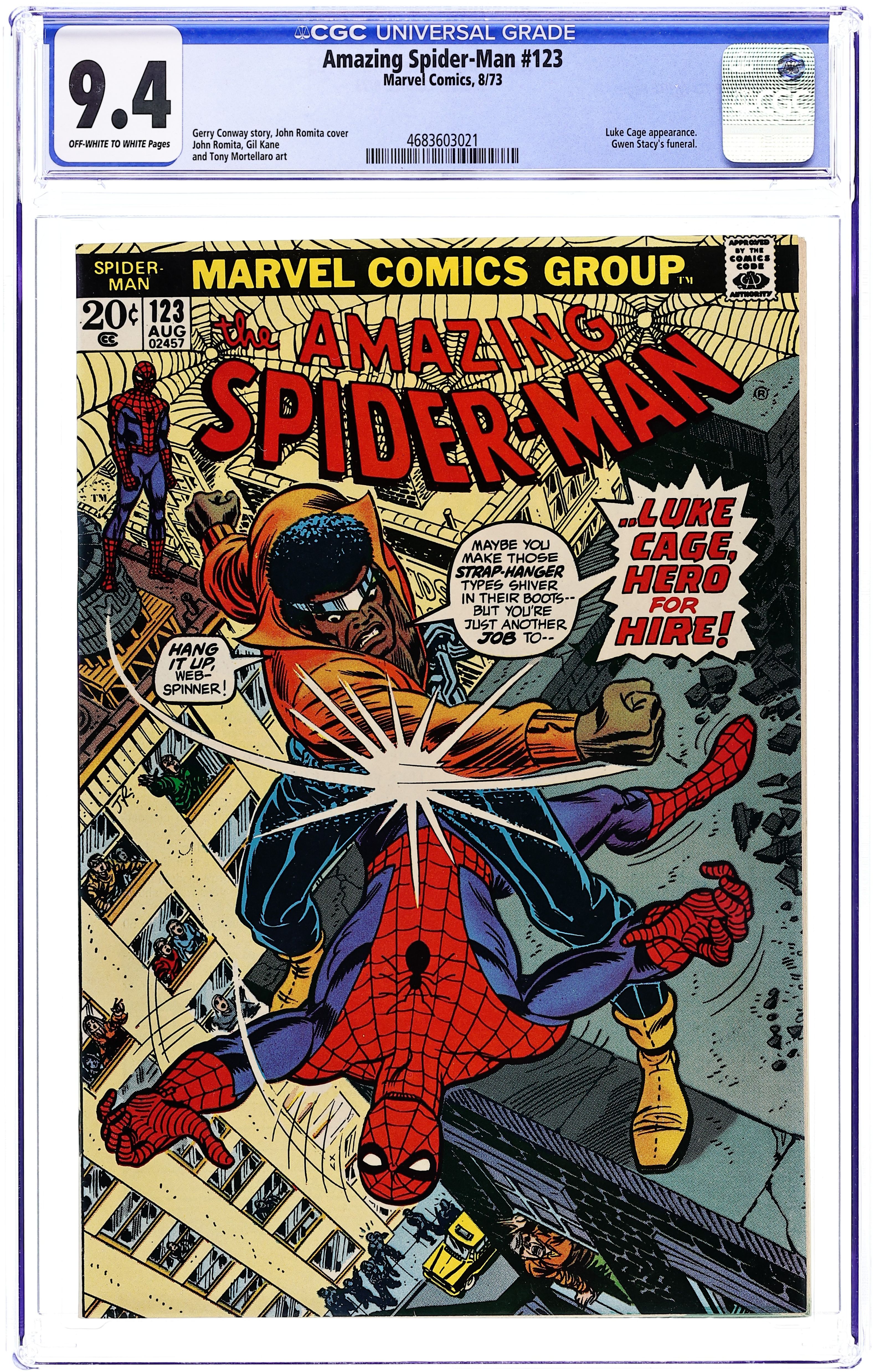 "...Just A Man Called Cage!" Guest-starring Luke Cage. Script by Gerry Conway. Pencils by Gil Kane and John Romita. Inks by John Romita and Tony Mortellaro (backgrounds). Cover by John Romita and Tony Mortellaro. While Peter Parker and his friends attend Gwen Stacy's funeral, J. Jonah Jameson plots revenge against the web-slinger for the death of Norman Osborn. The Daily Bugle publisher wants the wall-crawler captured dead or alive -- and he hires the powerful Luke Cage to do it! On a Manhattan rooftop, the Hero for Hire ambushes Spider-Man! And the super slugfest begins! The two heroes trade punches, body blows, and haymakers one after another! How will they break the stalemate -- before they break each other in half? Cameo appearances by Mary Jane Watson, Harry Osborn, Betty Brant, Joe Robertson, Flash Thompson, Anna Watson, Aunt May, and Norman Osborn (deceased). (Notes: This issue features the first meeting between Spider-Man and Luke Cage. The plot crosses over briefly with Power Man and Iron Fist (1972 Hero for Hire) #12. This story was reprinted in Marvel Tales 100.) 36 pages. Cover price $0.20.