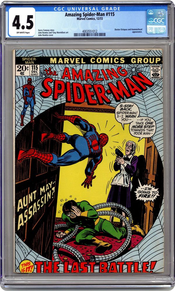 "The Last Battle!" Part 3 of 3. Script by Gerry Conway. Art by John Romita and Tony Mortellaro (backgrounds). Cover by John Romita. It's a wild shootout in Westchester as the gang war between Hammerhead and Dr. Octopus reaches its conclusion! And amidst the raging gun battle, Spider-Man finds Aunt May! But shockingly, Aunt May has thrown in with Doc Ock! So while dodging Doctor Octopus' arms and Hammerhead's bullets, the web-slinger has to make sure -- he doesn't get clipped by his dear aunt! In the meantime, the Daily Bugle learns about the firefight in Westchester; andJoe Robertson, Ned Leeds, and Gwen Stacy drive to the scene! Can your friendly neighborhood Spider-Man defeat two super-villains -- and save his Aunt May -- in one fell swoop? What a finish! Cameo appearances by J. Jonah Jameson and Betty Brant. (Notes: John Romita is credited as aco-plotter. Hammerhead and Dr. Octopus return in Amazing Spider-Man 130. This issue is reprinted in Marvel Tales #94.) 36 pages. Cover price $0.20.