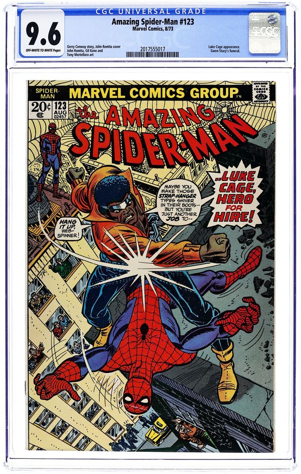 "...Just A Man Called Cage!" Guest-starring Luke Cage. Script by Gerry Conway. Pencils by Gil Kane and John Romita. Inks by John Romita and Tony Mortellaro (backgrounds). Cover by John Romita and Tony Mortellaro. While Peter Parker and his friends attend Gwen Stacy's funeral, J. Jonah Jameson plots revenge against the web-slinger for the death of Norman Osborn. The Daily Bugle publisher wants the wall-crawler captured dead or alive -- and he hires the powerful Luke Cage to do it! On a Manhattan rooftop, the Hero for Hire ambushes Spider-Man! And the super slugfest begins! The two heroes trade punches, body blows, and haymakers one after another! How will they break the stalemate -- before they break each other in half? Cameo appearances by Mary Jane Watson, Harry Osborn, Betty Brant, Joe Robertson, Flash Thompson, Anna Watson, Aunt May, and Norman Osborn (deceased). (Notes: This issue features the first meeting between Spider-Man and Luke Cage. The plot crosses over briefly with Power Man and Iron Fist (1972 Hero for Hire) #12. This story was reprinted in Marvel Tales 100.) 36 pages. Cover price $0.20.