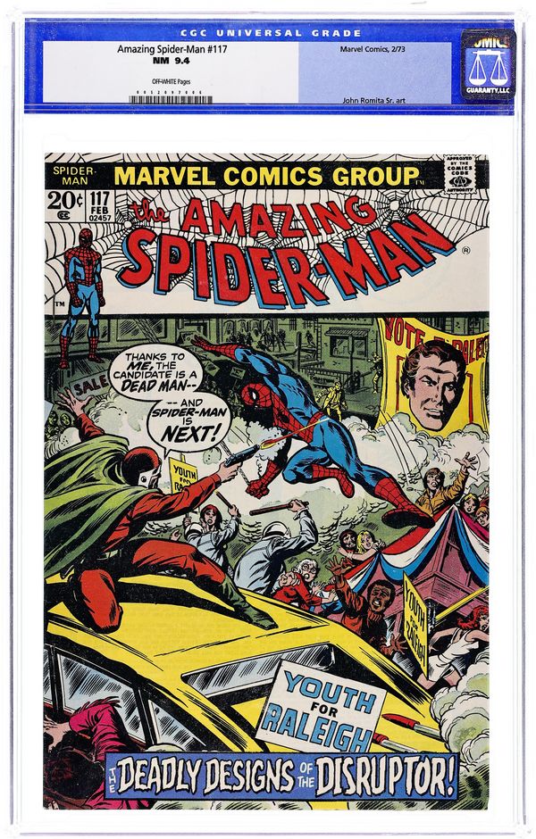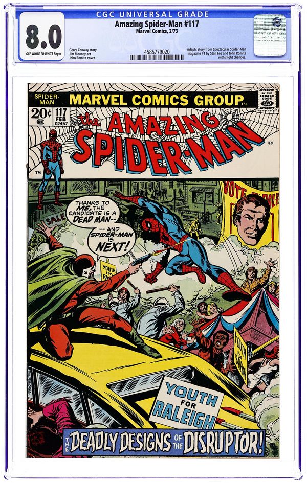 "The Deadly Designs of the Disruptor!" Part 2 of 3. Script by Stan Lee (original) and Gerry Conway (updates). Pencils by John Romita. Inks by Jim Mooney, Mike Esposito, and Tony Mortellaro (backgrounds). Cover by John Romita and Jim Mooney. Thanks to the speed and skill of the wall-crawler, everyone survived the ceiling collapse at Richard Raleigh's election rally! And now the hunt is on for the culprit! Meanwhile, Raleigh holds another rally. And this one is sabotaged by the Disruptor! Who is he? No one knows, but the Disruptor is bound and determined to shut down Raleigh's bid for mayor! And it falls to Spider-Man to save the vote! Cameo appearances by J. Jonah Jameson, Joe Robertson, Norman Osborn, Gwen Stacy, Mary Jane Watson, Harry Osborn, Aunt May, and the Smasher. (Notes: ASM issues 116-118 are a revised, re-edited, and colorized version of Spectacular Spider-Man Magazine #1. This issue includes numerous new panels and pages to align with Spider-Man's current continuity. ASM 117 was reprinted in Marvel Tales #96.) 32 pages. Cover price $0.20.