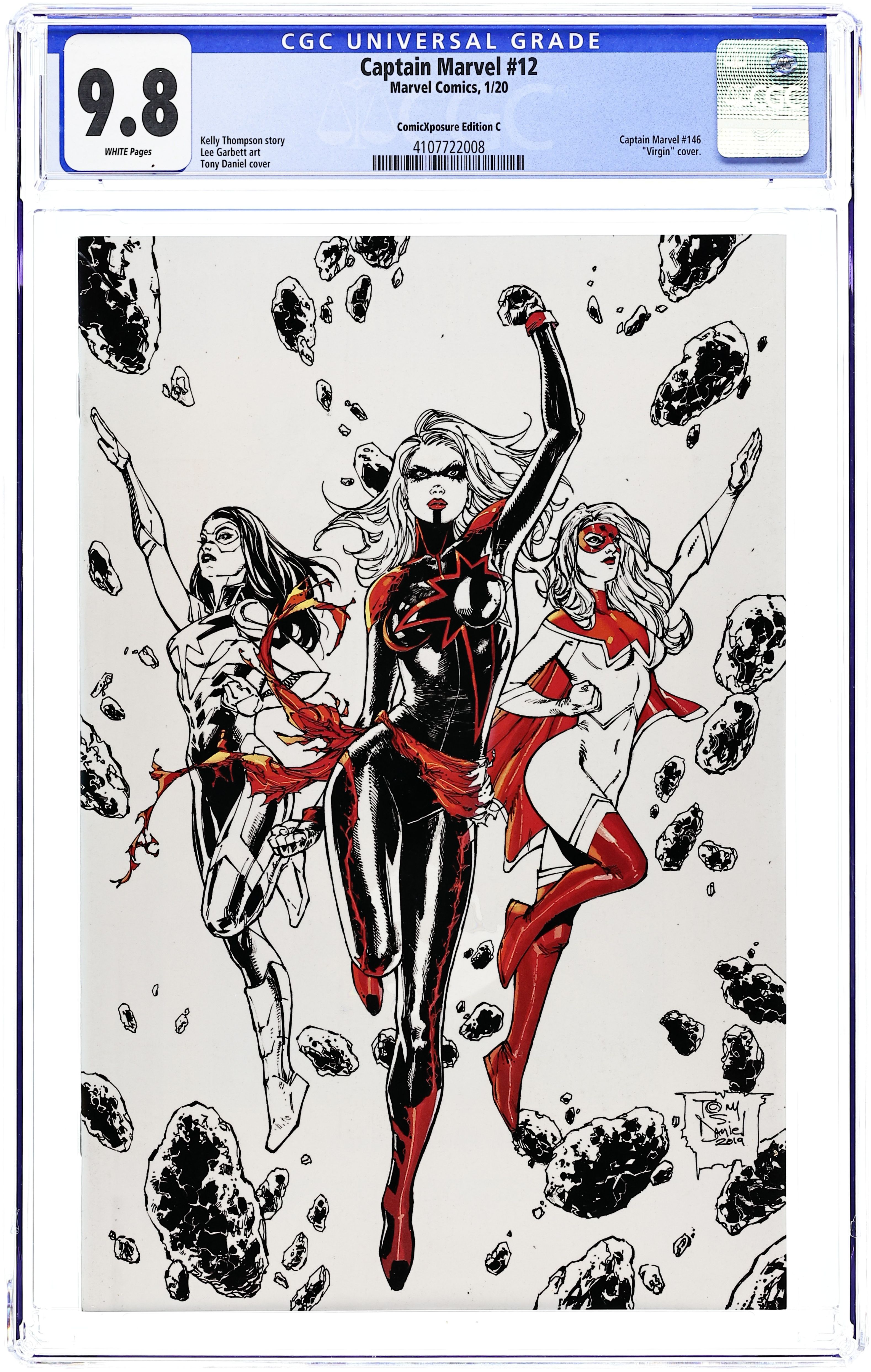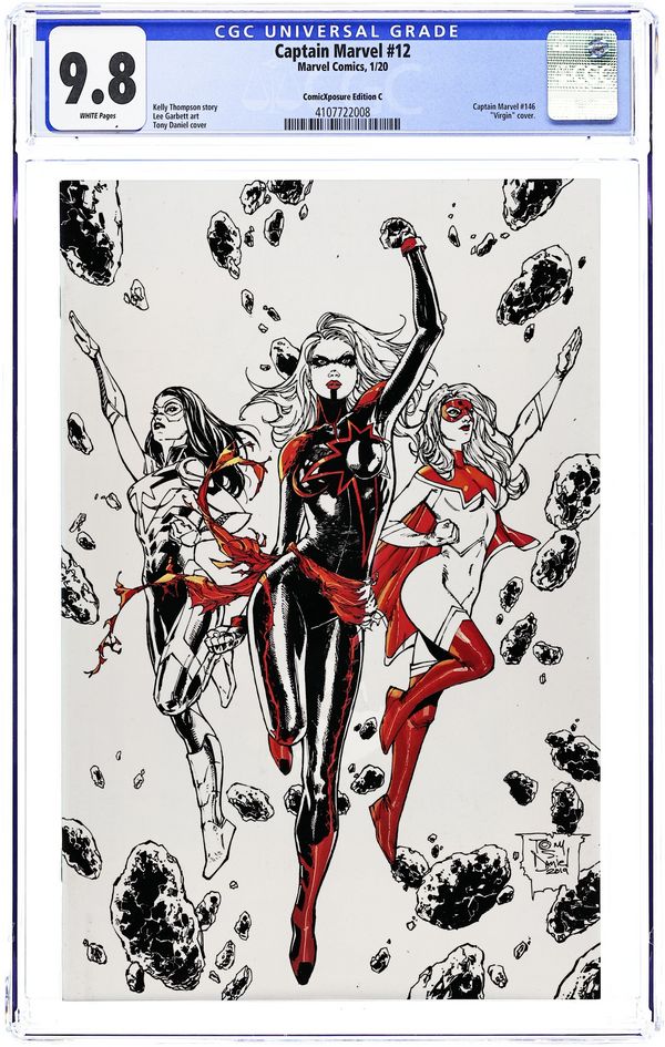 ComicXposure Exclusive Spot Color Edition Virgin Cover by Tony Daniel. Written by Kelly Thompson. Art by Lee Garbett. CAPTAIN MARVEL VERSUS THE AVENGERS! THE LAST AVENGER! Captain Marvel has fought off alien hordes. Rescued X-Men. Punched Thanos in the face. Literally saved the world. She now faces her greatest challenge: kill the Avengers. Has one of the world's most powerful heroes gone dark? But why? And what does this mean for Carol...for the world? Life on earth will never be the same. Kelly Thompson teams up with Eisner-nominated artist Lee Garbett for a brand-new arc - and a bold new direction! 28 pages, full color. Rated T+ Cover price $3.99.