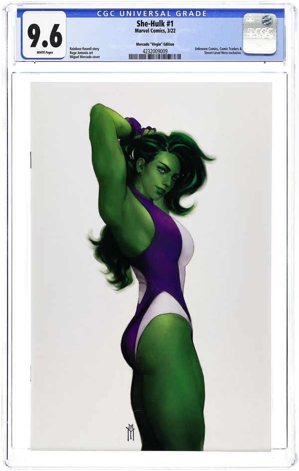 Comics Illuminati (Unknown Comics, Street Level Hero, and Comic Traders) Exclusive Virgin Cover by Miguel Mercado. Written by Rainbow Rowell. Art by Roge Antonio. The best character ever is back in her own series and about to glam up the whole Marvel Universe! Jennifer Walters, A.K.A. the Sensational She-Hulk, is no longer savage and needs to put her life back together. She's got a career to rebuild, friends to reconnect with (and maybe represent in a court of law) and enemies to…well, she may not want to connect with them, but they are DEFINITELY going to connect with her. And the last page of this first issue is going to send Jen down a road she's never traveled and that will shake up her life and possibly the whole Marvel Universe. 28 pages, full color. Rated T+