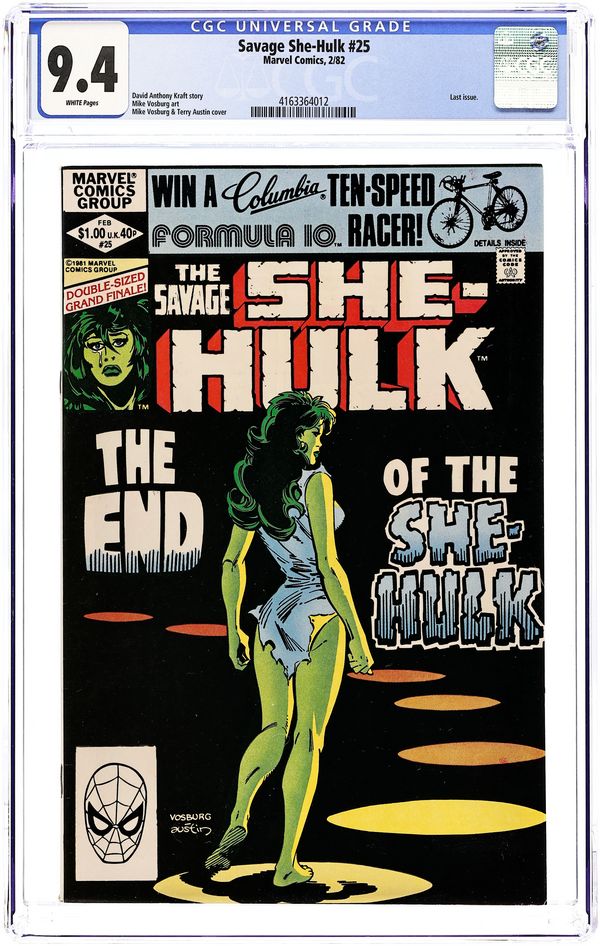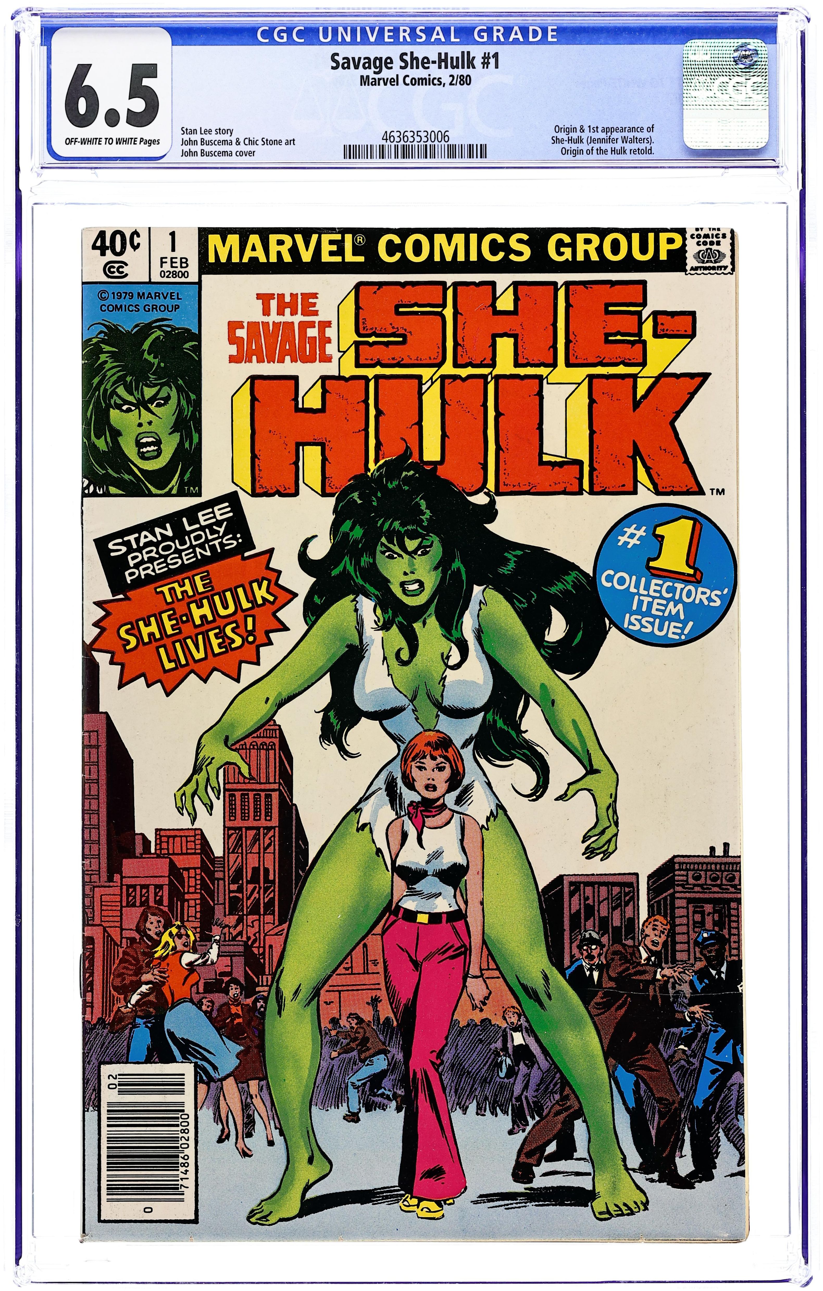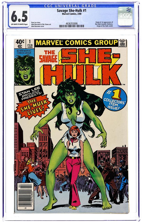 Newsstand Edition. 1st appearance and origin of the She Hulk. "The She-Hulk Lives!" Guest-starring Bruce Banner. Story by Stan Lee. Art by John Buscema and Chic Stone. Jennifer Walters is on the verge of death after an attempted assassination, and the only thing that will save her life is a blood transfusion from her cousin, Bruce Banner...AKA the Incredible Hulk! His gamma-irradiated blood sparks a startling transformation in his cousin, and she will forevermore be known as the Savage She-Hulk! Cover price $0.40.