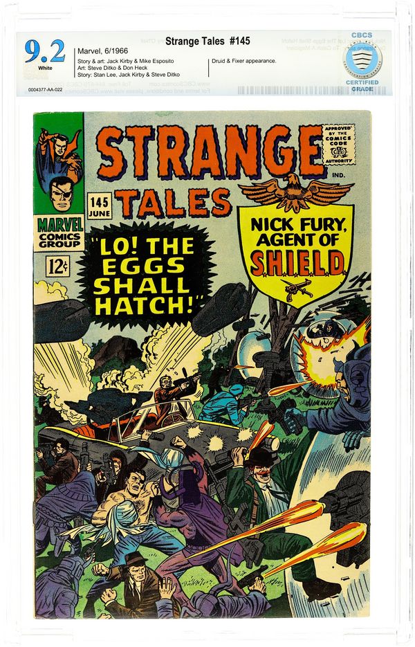 Cover pencils by Jack Kirby and Steve Ditko (bottom tier), inks by Mike Esposito and Steve Ditko (bottom tier). "Find Fury or Die!", script by Stan Lee and Jack Kirby (co-plot), pencils by Jack Kirby (layouts) and John Severin, inks by John Severin; HYDRA agents tail Fury intent on finding SHIELD's HQ, but Fury is aware he's being followed. HYDRA Section Leader B, a "Hydra-Hunter," runs the mission and hands over his hood to the Imperial Hydra so he will have no place to hide should he fail; When a few HYDRA agents show up at the barber shop which is the secret entrance to SHIELD's HQ, they're captured and hypnotized into believing the HQ is located in a warehouse blocks away. "What Lurks Beneath the Mask?", script by Steve Ditko (plot) and Stan Lee (dialogue), art by Steve Ditko; Dormammu imprisons Clea, telling her she will witness Strange's defeat. Mordo tells Dormammu that Strange is searching for "Eternity" and is puzzled by the dark lord's violent reaction; Strange continues his search, going from one mystic to another with no results, until The Aged Genghis tells him only he and The Ancient One know the secret; He gives him a scroll, which leads Strange to a being imprisoned in another dimension; a trap he barely escapes. 36 pgs., full color. Cover price $0.12.