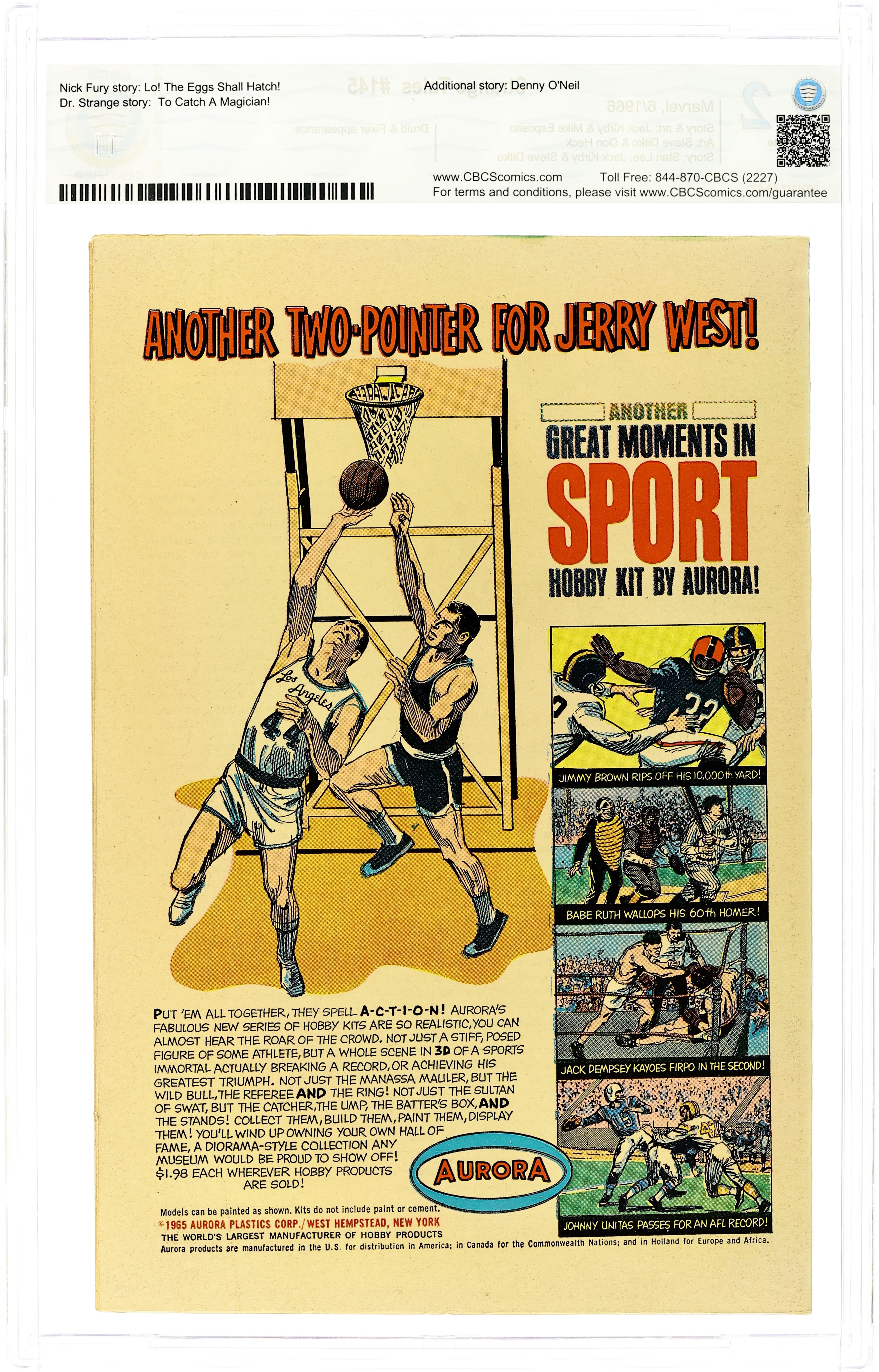 Cover art by Dan Adkins. "Nothing Can Halt... Voltorg!", script by Jim Lawrence and Dan Adkins (co-plot), pencils by George Tuska, inks by Dan Adkins; A running battle ensues between Strange and the lightning-hurling Voltorg, which nearly destroys Yandroth's lab before Strange finally takes it out. Yandroth grabs Victoria and uses a "Teleportation" machine to instantly send the two of them to a far-distant world; Strange tries to alter the destination setting so they'll end up on Earth, then follows, winding up in Stonehenge, the very place where his mentor apparently met his demise. Nick Fury stars in "If Death Be My Destiny!", script and pencils by Jim Steranko, inks by Joe Sinnott; Using a H.A.W.K. Harness Fury pursues the Claw's escaping airship and discovers his underwater hideout in New York Harbor; The Heli-Carrier's vortex beam holds The Sky Dragon stationary while SHIELD mops up The Claw's men; Fury uses a Pyro-Band to burn into The Claw's lair finding himself in a complex maze. 36 pgs., full color. Cover price $0.12.