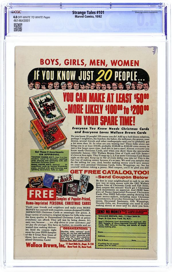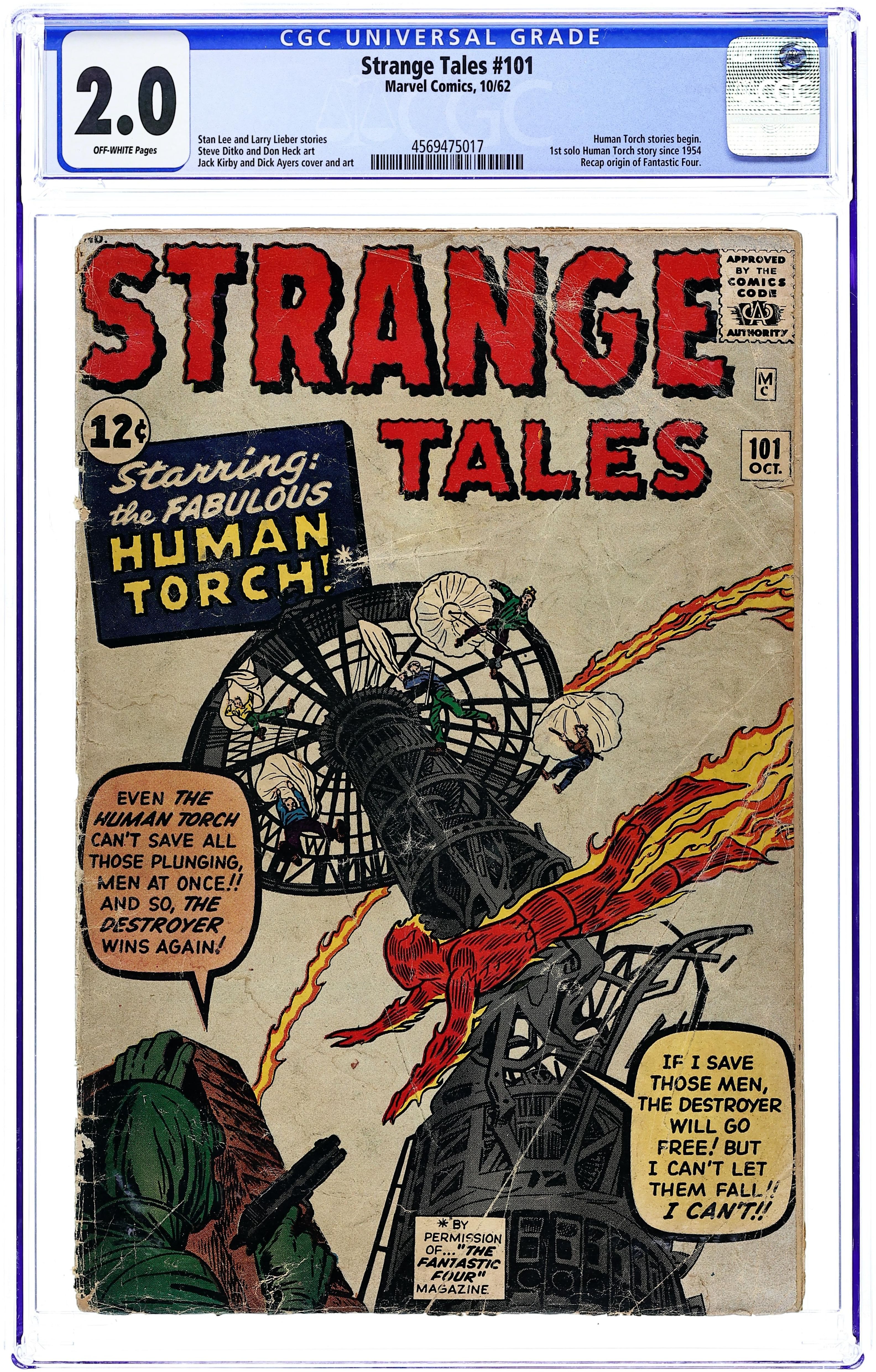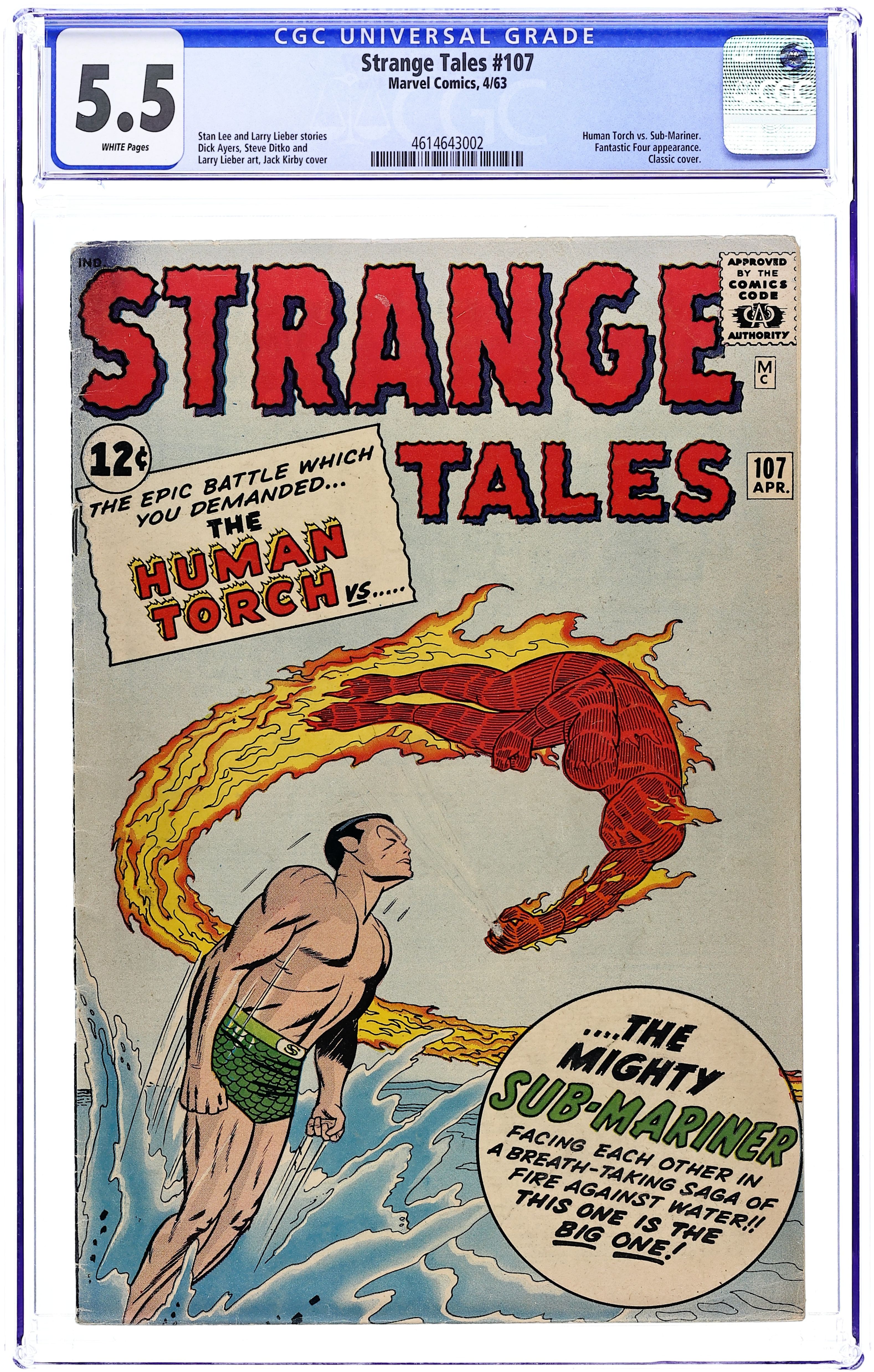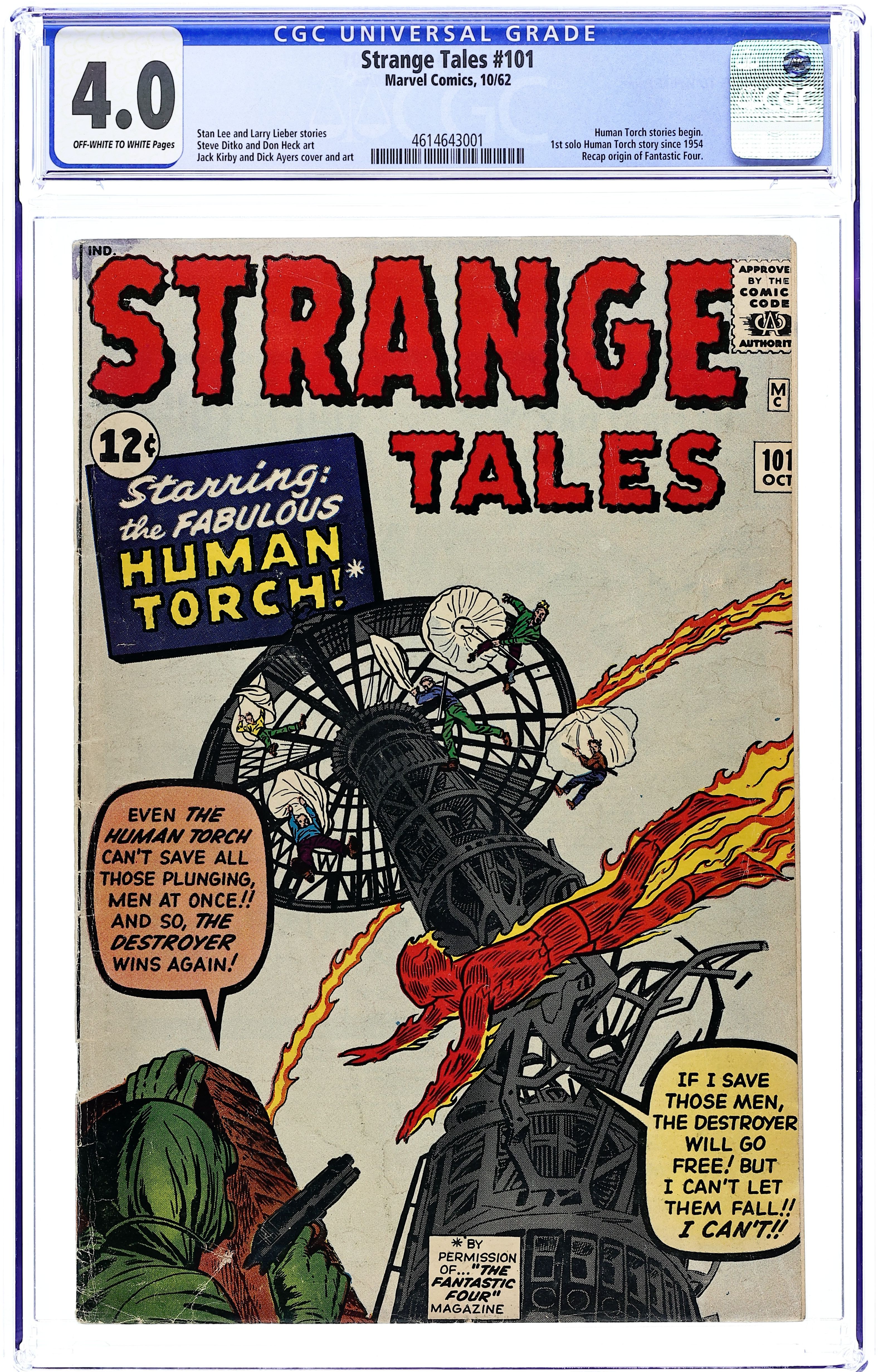 Cover pencils by Jack Kirby, inks by Dick Ayers. Doctor Strange makes his landmark first appearance in this issue in "Dr. Strange Master of Black Magic!", a 5-page back-up story, script by Steve Ditko (plot) and Stan Lee (script), art by Steve Ditko; Doctor Strange is called on by a man having bad dreams, and confronts Nightmare; The mans dreams reveal that he is guilty of fraud and Strange makes him confess; First appearances of Nightmare, the Ancient One, and Wong. The Human Torch is cover featured in "The Human Torch vs. the Wizard and Paste-Pot Pete!", script by Stan Lee (plot) and Ernie Hart [as H.E. Huntley] (script), art by Dick Ayers; Johnny practices on his obstacle course, then thinks back on his adventures with The Wizard and Paste-Pot Pete; By a wild coincidence, Pete breaks The Wizard out of jail and the two join forces. "Silent Stranger" text story. "We Search the Stars!", script by Stan Lee (plot) and Larry Lieber (script), pencils by Larry Lieber, inks by Matt Fox; A space expedition discovers what they believe is a savage human-like species and flee, not suspecting that they are an advanced psychic race able to meet all their needs through thought. 36 pgs., full color. Cover price $0.12.