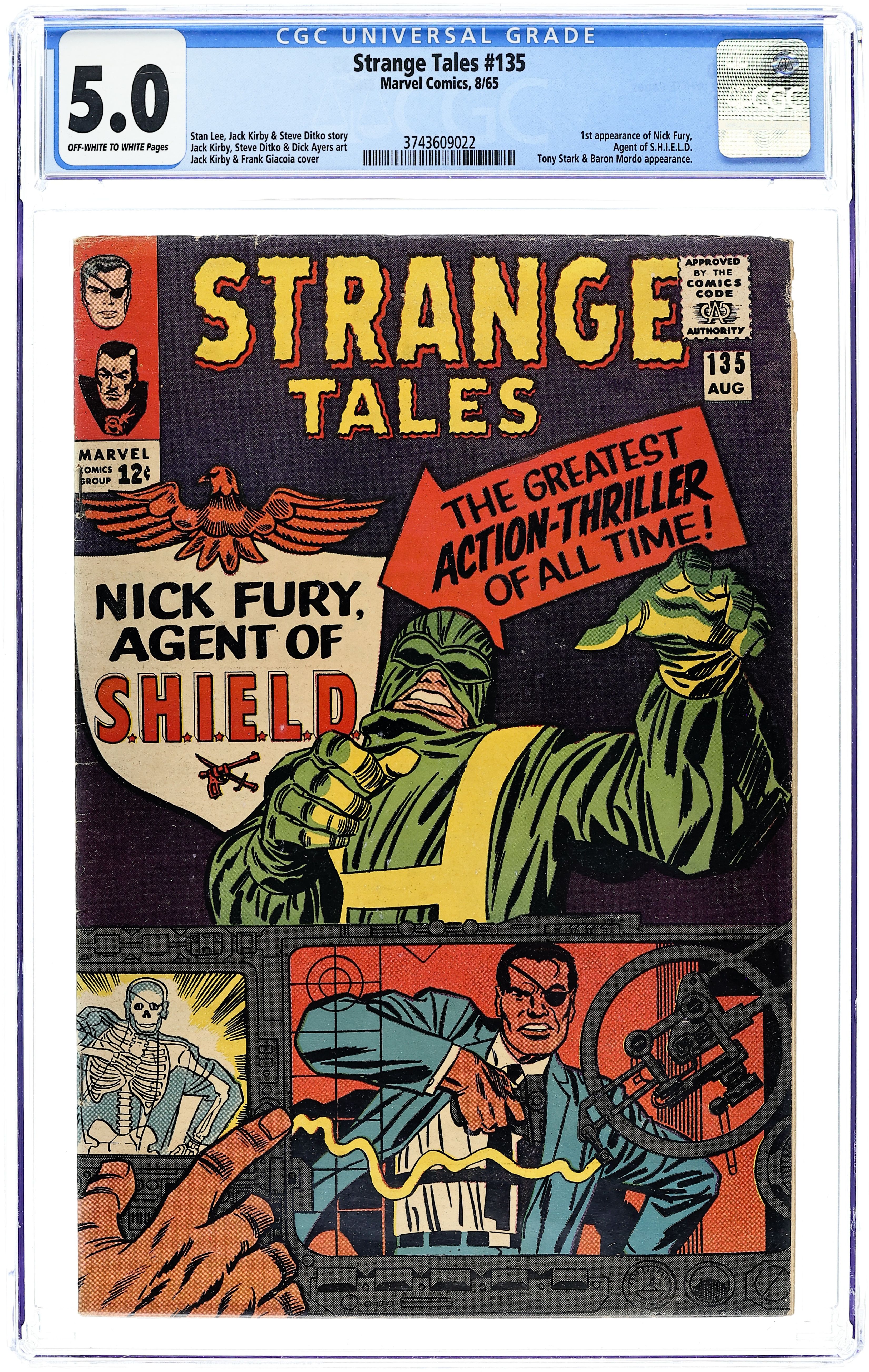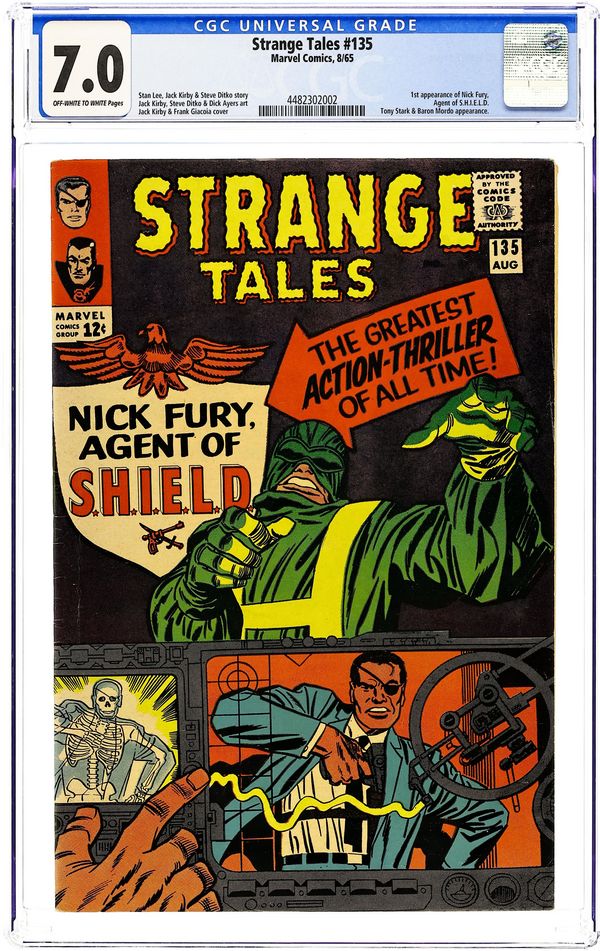 Cover pencils by Jack Kirby, inks by Frank Giacoia. "The Man for the Job!", script by Stan Lee and Jack Kirby (co-plot), pencils by Jack Kirby, inks by Dick Ayers; Nick Fury reports to the Pentagon, encountering Life Model Decoys: replicas of himself; He is driven in a gadget-filled car that converts to flying mode; Fury learns about SHIELD, an international organization whose job is to stop HYDRA, fanatics bent on world domination; Fury meets Tony Stark, in charge of SHIELD's weaponry, who tells Fury he was chosen to lead SHIELD. "Eternity Beckons!", script by Steve Ditko (plot) and Stan Lee (dialogue), art by Steve Ditko; In London, seeking info on "Eternity," Dr. Strange goes to the secluded home of Sir Baskerville, a former disciple of Mordo's, who greets him as an old friend; Meanwhile, Dormammu discovers that Clea set the Mindless Ones free and swears she will pay for her betrayal; Baskerville contacts Mordo, who sends an emissary to trap Strange but it backfires, allowing Strange to discover that Dormammu is the one behind Mordo's attacks and increased power. Notes: 1st S.H.I.E.L.D., 1st Hydra, 1st Nick Fury as agent of shield, 1st appearance of LMD (Life Model Decoy). 36 pgs., full color. Cover price $0.12.