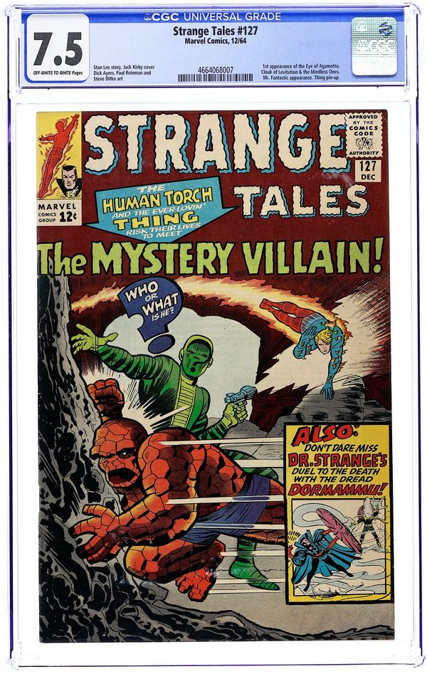 Cover pencils by Jack Kirby and Steve Ditko (inset), inks by Chic Stone and Steve Ditko (inset). The Human Torch and the Thing star in "The Mystery Villain!", script by Stan Lee (co-plot, dialogue) and Dick Ayers (co-plot), pencils by Dick Ayers, inks by Paul Reinman; Following a race, Ben and Johnny complain to Reed that they've done pretty good and don't need a leader; Reed tells them they're free to work on their own; Ben and Johnny take part in a high-speed race, but discover on arrival that they're the only two contestants; Sub-Mariner cameo. "Duel with the Dread Dormammu!", script by Steve Ditko (plot) and Stan Lee (dialogue), art by Steve Ditko; The mysterious girl appears and takes Strange to The Mindless Ones, destructive creatures who are held back from killing by Dormammu's willpower; Dormammu imprisons the girl for betraying him and the battle begins; With Dormammu concentrating on defeating his foe the barrier holding The Mindless Ones collapses; he is forced to join forces with Strange to stop them; Guest starring Clea; Dr. Strange receives his amulet and red-and-yellow cloak of levitation from the Ancient One. A Marvel Masterwork Pin-Up of The Thing, pencils by Jack Kirby, inks by Chic Stone. 36 pgs., full color. NOTE: 2nd appearance of Dormammu and Clea. 1st appearance of The Eye of Agamotto and Cloak of Levitation. 1st battle between Doctor Strange and Dormammu. Cover price $0.12.