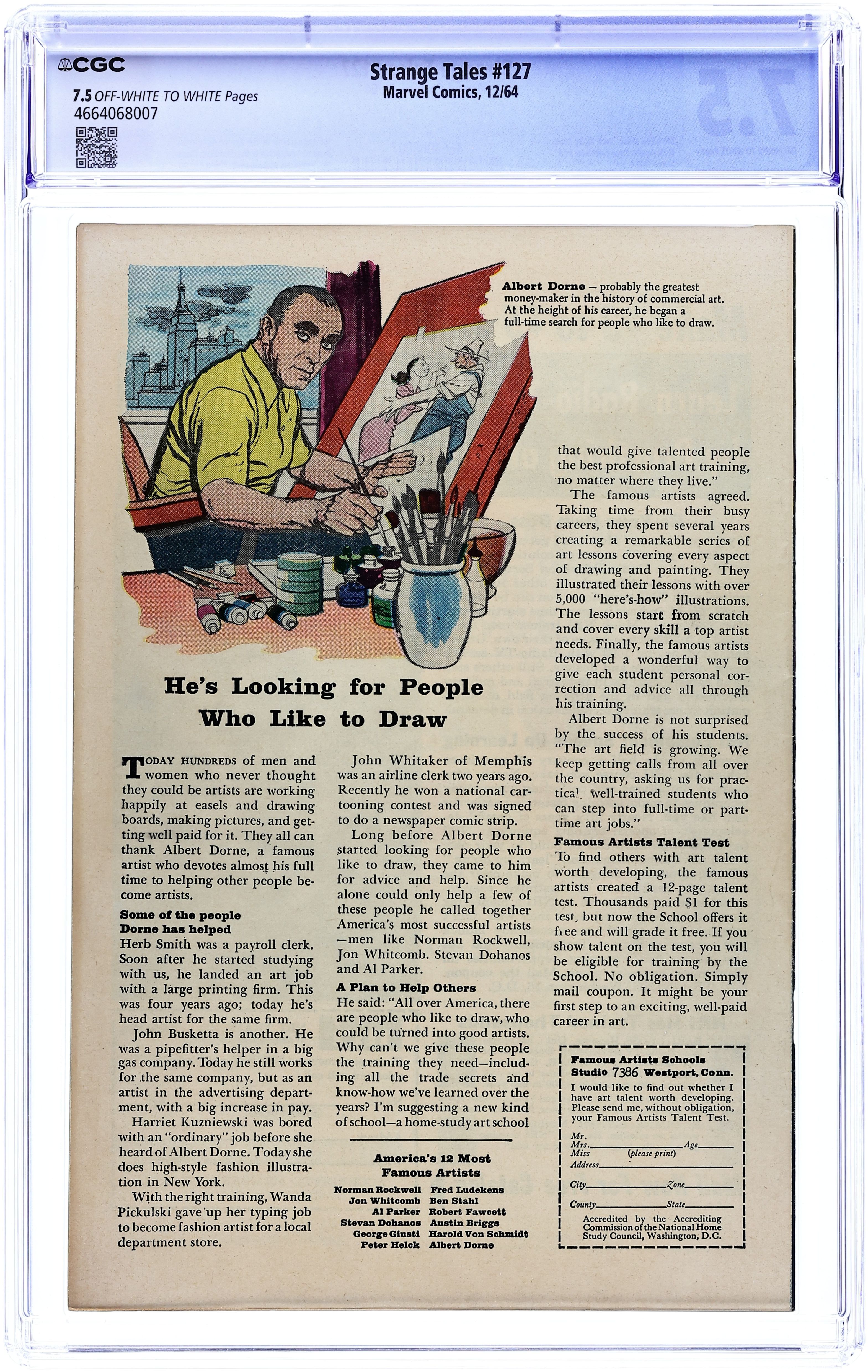 Cover pencils by Jack Kirby, inks by Dick Ayers. The Human Torch and the Thing star in "The Sub-Mariner Must Be Stopped!", script by Stan Lee, pencils by Dick Ayers, inks by Paul Reinman; Ben and Johnny's hi-jinks are interrupted by the arrival of a pair of LIFE Magazine reporters, who are there to interview Reed and Sue; When the news reports Sub-Mariner is heading for NYC, Ben and Johnny figure they can make an impression by tackling him on their own. "Mordo Must Not Catch Me!", script by Stan Lee and Steve Ditko (co-plot), pencils by Steve Ditko, inks by George Roussos (as Geo. Bell); Three followers of Mordo attack Strange in his sanctum; After dispatching them, he uses the Eye of Agamotto and his amulet to contact his mentor, but to no avail!; Mordo appears saying he's captured The Ancient One; In their ectoplasmic forms, a running battle begins that takes them halfway around the world, until Strange locates his mentor in a half-hidden jungle somewhere in Tibet. First page of a 2-page text story, "The Message." (The second page does not appear in issue 126 and may never have been published!) 36 pgs., full color. Cover price $0.12.