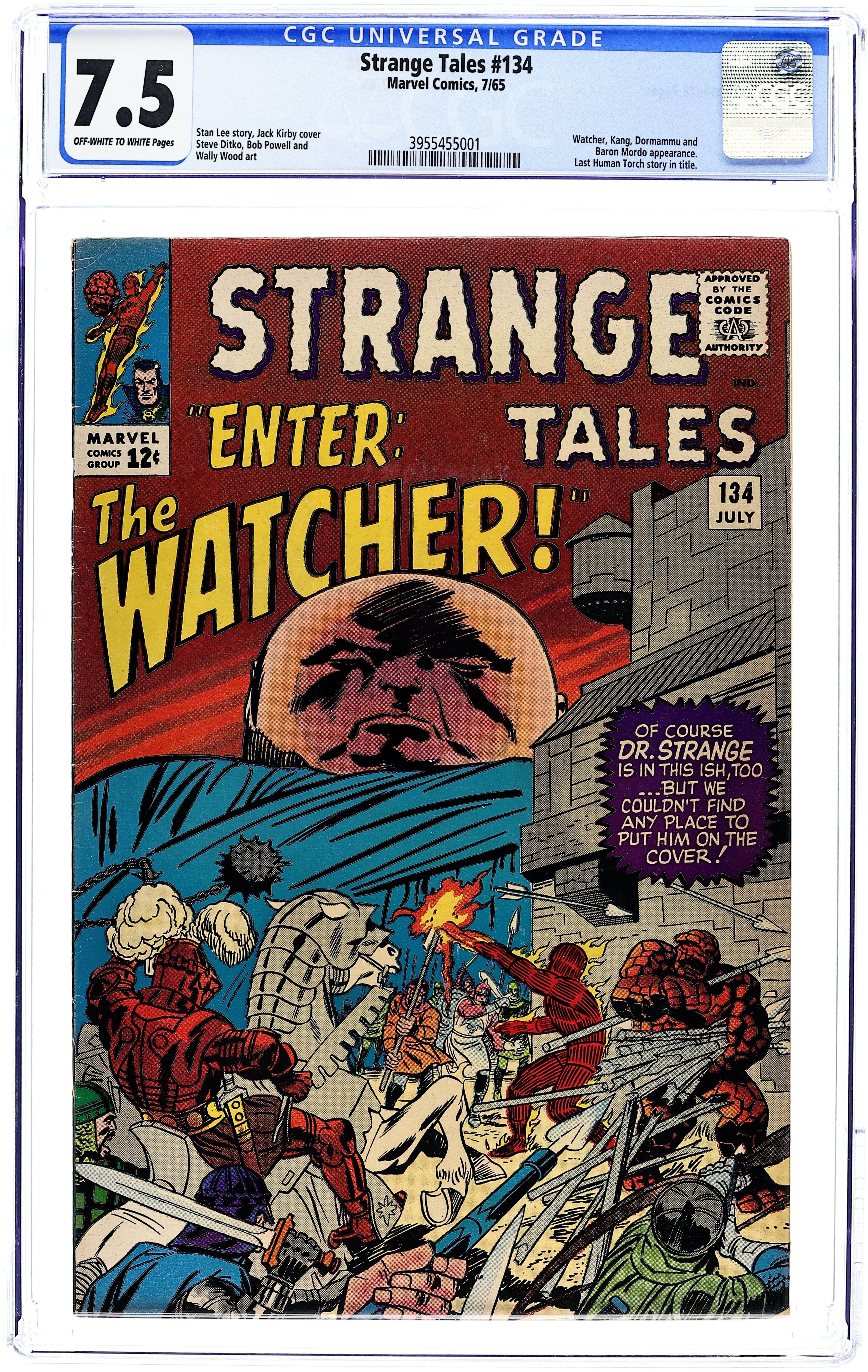 Cover pencils by Jack Kirby, inks by Frank Giacoia. The Human Torch and the Thing star in "The Challenge of...The Watcher!", script by Stan Lee and Bob Powell (co-plot), pencils by Bob Powell, inks by Wally Wood; Though he is not permitted to interfere, The Watcher tells Ben & Johnny of how Kang time-travelled to the days of King Arthur, imprisoned Merlin, and took over the country; In order for the time stream to remain intact, The Watcher sends the pair back in time to defeat Kang; Cameos by Sue Storm and Reed Richards. "Earth Be My Battleground," script by Steve Ditko (plot) and Stan Lee (dialogue), art by Steve Ditko; Dr. Strange returns to earth but remains in hiding. Mordo's spirits discover Strange and pursue him; Meanwhile Clea distracts Dormammu by freeing The Mindless Ones; They attack, causing Dormammu to leave Mordo on his own. Strange flies into space and straight into the sun, the spirits fleeing and Mordo worried that it might spell his doom; Strange returns to The Ancient One, who in his weak, delirious condition, speaks of "Eternity"; Appearance by Clea. 36 pgs., full color. Cover price $0.12.