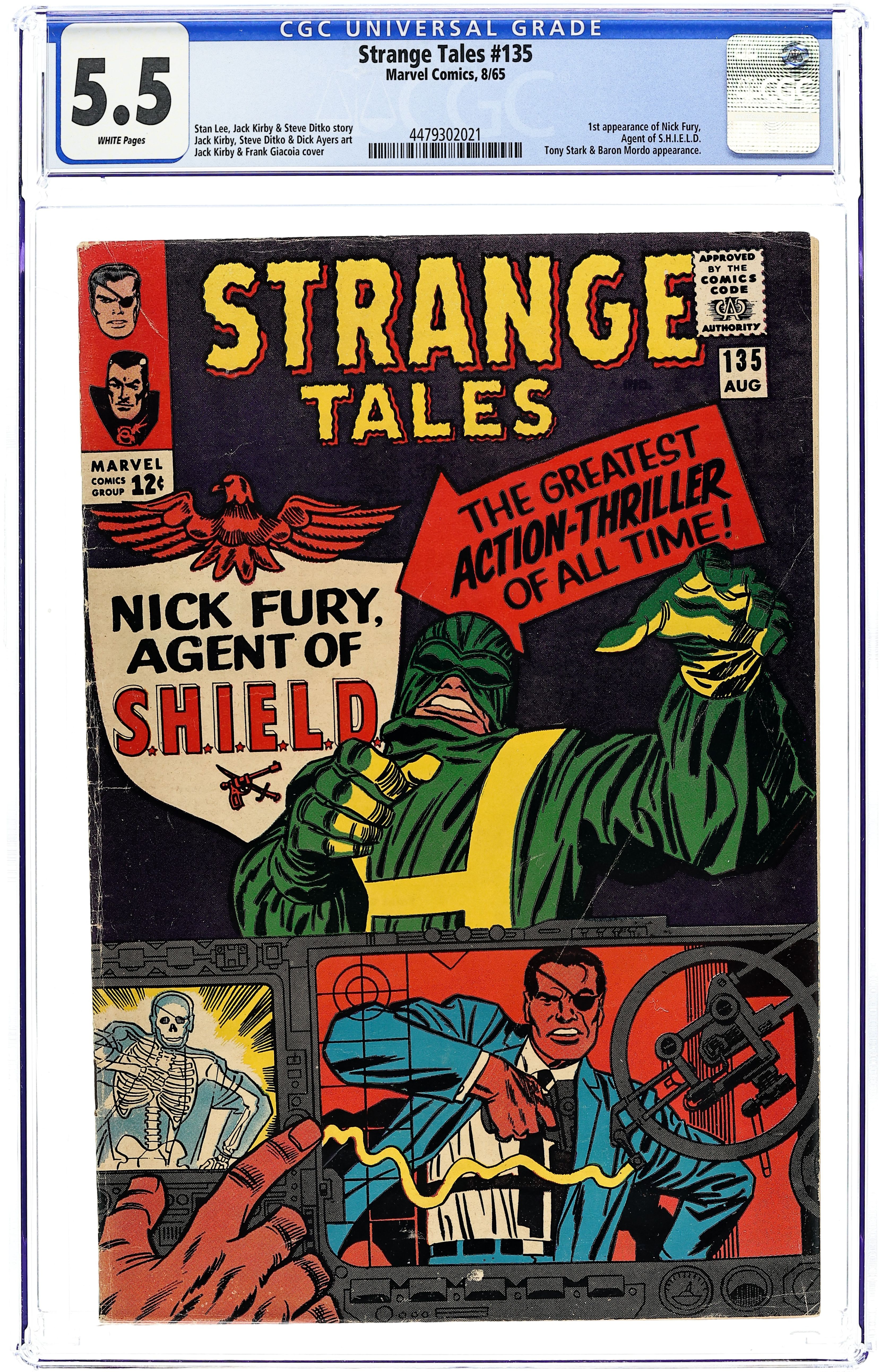 Cover pencils by Jack Kirby, inks by Frank Giacoia. "The Man for the Job!", script by Stan Lee and Jack Kirby (co-plot), pencils by Jack Kirby, inks by Dick Ayers; Nick Fury reports to the Pentagon, encountering Life Model Decoys: replicas of himself; He is driven in a gadget-filled car that converts to flying mode; Fury learns about SHIELD, an international organization whose job is to stop HYDRA, fanatics bent on world domination; Fury meets Tony Stark, in charge of SHIELD's weaponry, who tells Fury he was chosen to lead SHIELD. "Eternity Beckons!", script by Steve Ditko (plot) and Stan Lee (dialogue), art by Steve Ditko; In London, seeking info on "Eternity," Dr. Strange goes to the secluded home of Sir Baskerville, a former disciple of Mordo's, who greets him as an old friend; Meanwhile, Dormammu discovers that Clea set the Mindless Ones free and swears she will pay for her betrayal; Baskerville contacts Mordo, who sends an emissary to trap Strange but it backfires, allowing Strange to discover that Dormammu is the one behind Mordo's attacks and increased power. Notes: 1st S.H.I.E.L.D., 1st Hydra, 1st Nick Fury as agent of shield, 1st appearance of LMD (Life Model Decoy). 36 pgs., full color. Cover price $0.12.
