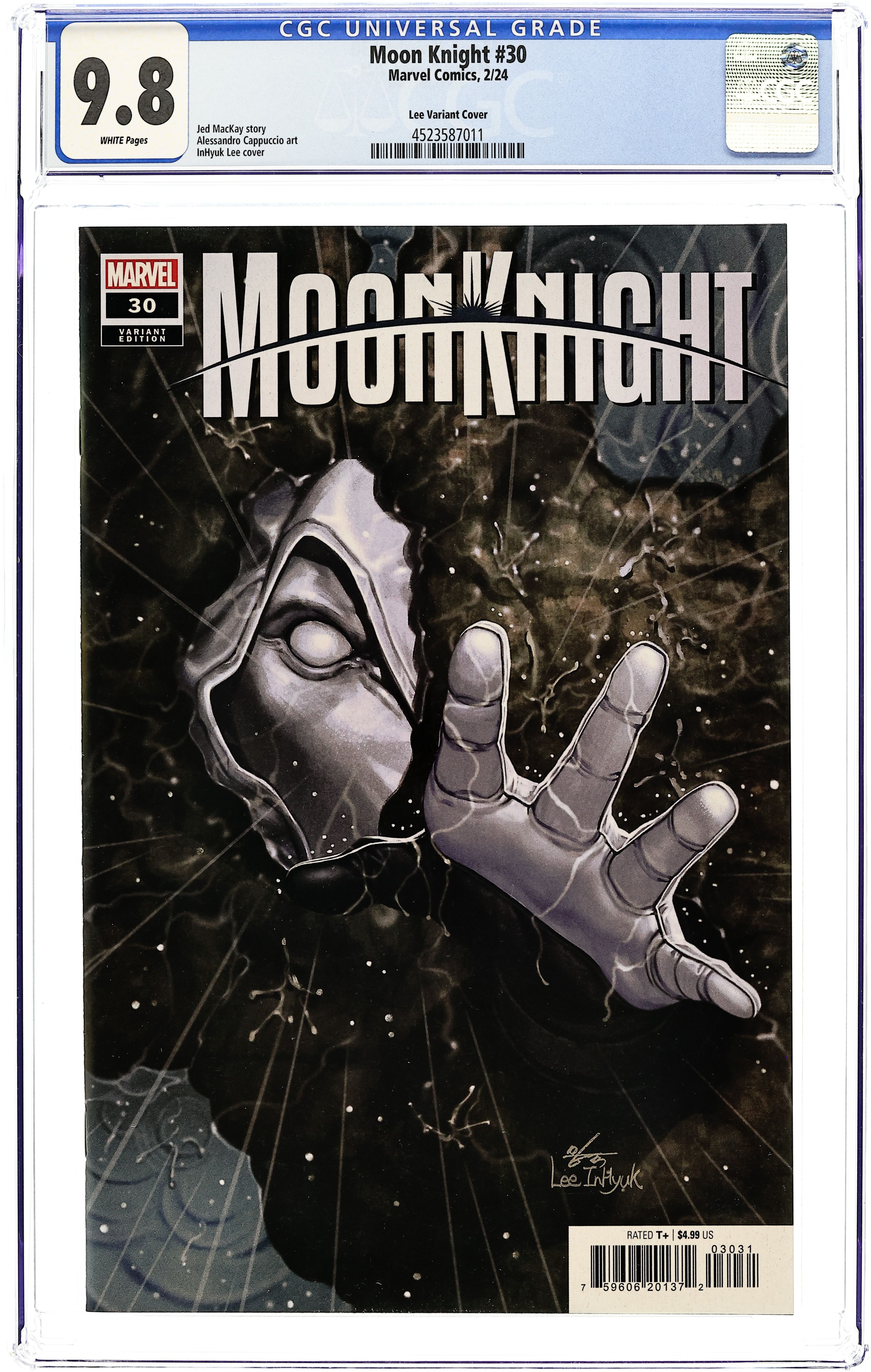 Written by Jed MacKay. Art by Alessandro Cappuccio. Cover by Inhyuk Lee. THE TERMINAL SECONDS OF MOON KNIGHT! KNIGHT'S END! The Battle of the Mount reaches an explosive conclusion, and all that stands in the way of the Black Spectre's scheme of annihilation is Moon Knight. But can Moon Knight triumph against the odds arrayed against him, or will the Mount stand as his tombstone? With all hope of resurrection gone, Moon Knight's life hangs on the line along with Manhattan! 36 pages, full color. Rated T+ Cover price $4.99.