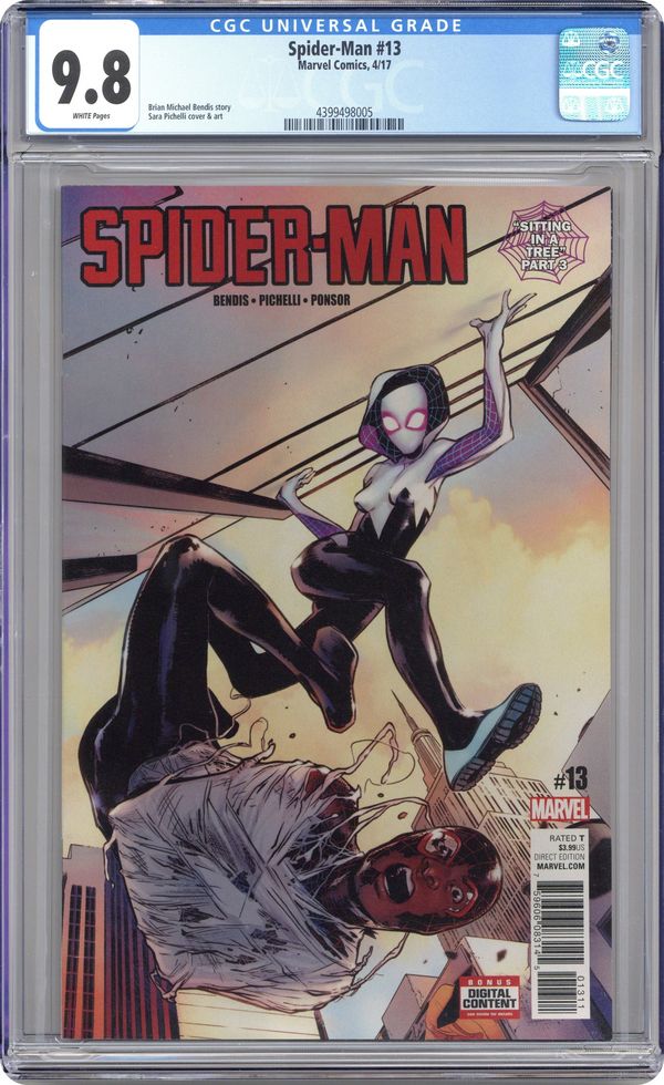 Sitting in a Tree: Part 3 of 6 - Written by Brian Michael Bendis. Art and Cover by Sara Pichelli. Story continued from Spider-Gwen (2015 2nd Series) #16. Miles and Gwen's adventure takes them back to Gwen's dimension in pursuit of someone very important to Miles. But something about the pursuit puts our heroes at odds! Story continues in Spider-Gwen (2015 2nd Series) #17. 28 pages, full color. Rated T Cover price $3.99.