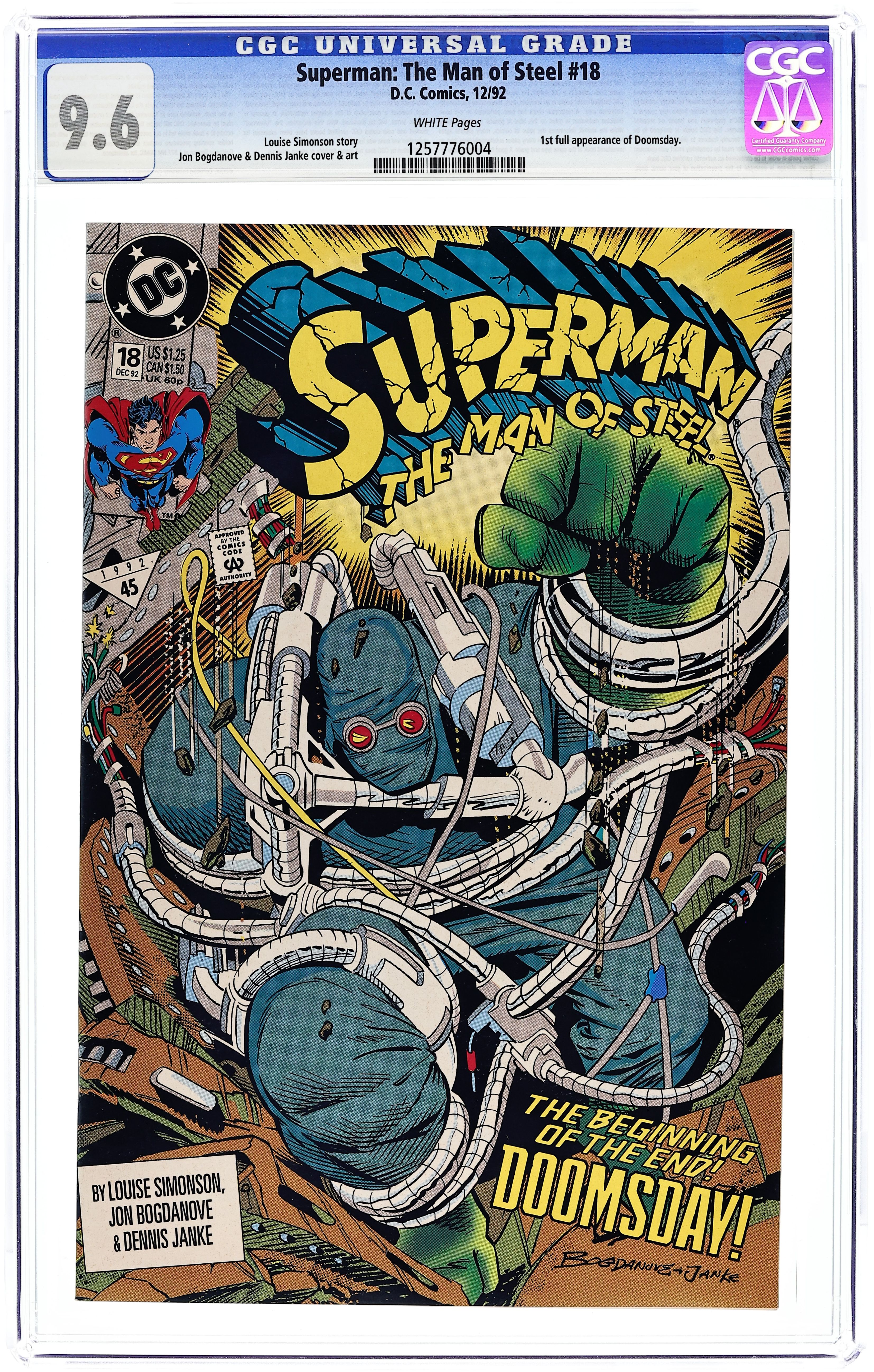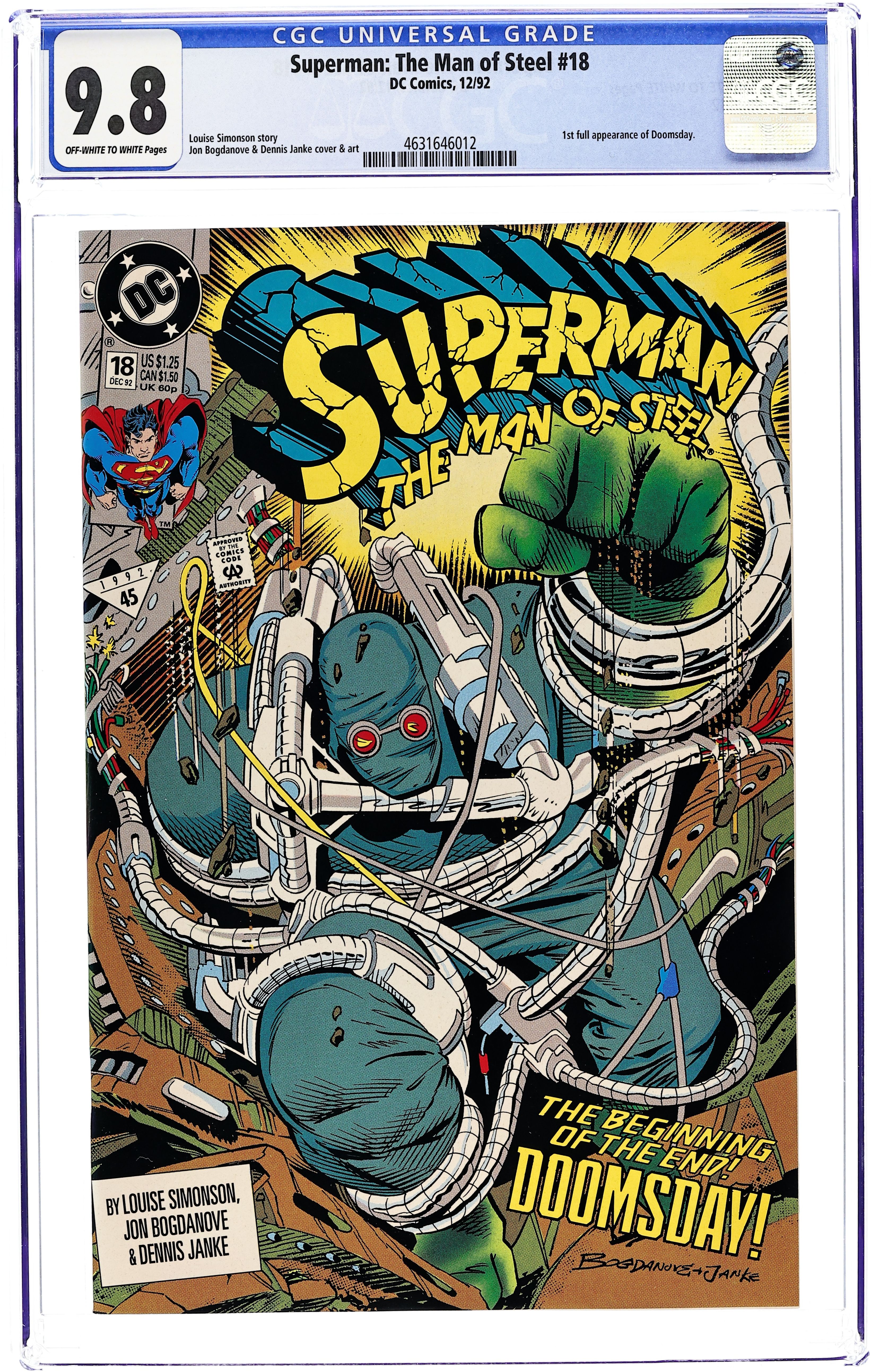 Starts Dec 8 First Printing. Direct Edition. Part 1 of the 7-part 'Doomsday': A pivotal event is coming in the Man of Steel's life as Doomsday arrives...and Superman would be best served to stay out of the way! Continues in Justice League America (1987) #69 and then in Superman (1987) #74. Written by Louise Simonson, with art and cover by Jon Bogdanove and Dennis Janke. Cover price $1.25.