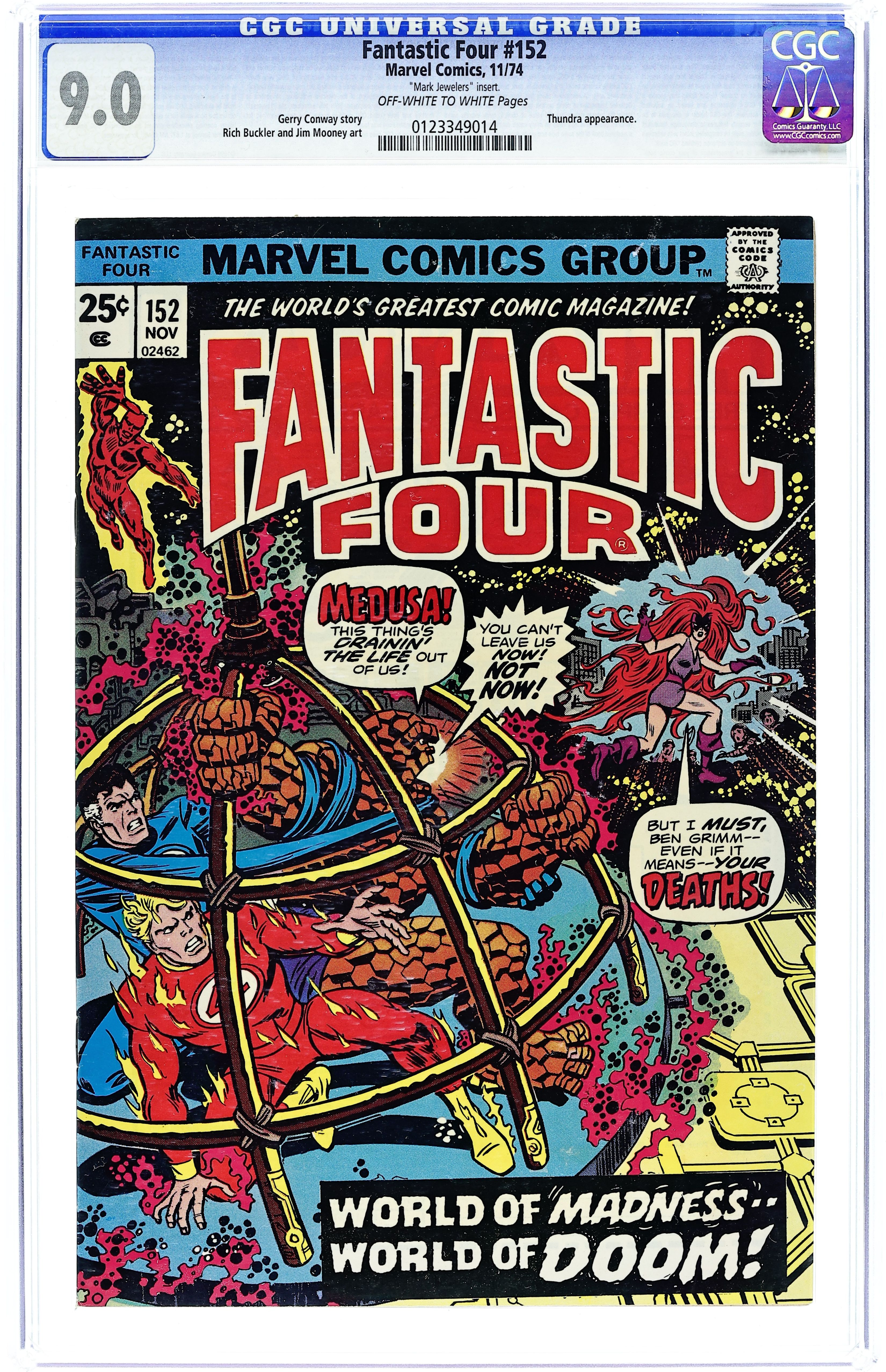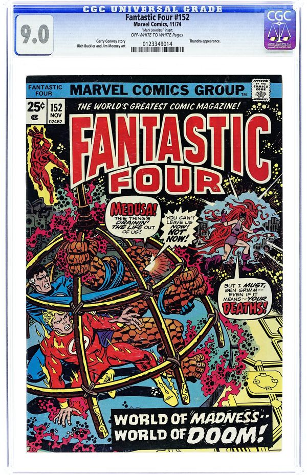 Mark Jewelers Advertisement Insert Variant. "A World of Madness Made!" Part 2 of 3. Guest-starring Thundra. Script by Gerry Conway. Art by Rich Buckler (layouts) and Jim Mooney (finishes). Cover by Rich Buckler and John Romita. Thundra attacks Mahkizmo, the Nuclear Man, in order to give Reed, Ben, and Johnny a chance to recover from their fight! But in a brilliant flash of light, the powerful femizon and the monster from Machus vanish from the Baxter Building. Where did they go? Reed thinks somewhere in the future, so the Human Torch, Medusa, Thing, and Mr. Fantastic use Dr. Doom's time machine to go forward in time...to Machus! How will the FF fare in round two vs. Mahkizmo? Cameo appearances by the Invisible Girl and Franklin. (Note: The letters page contains Marvel Value Stamp series A #23 Sgt. Fury by Dick Ayers and John Severin.) 32 pages Cover price $0.25.