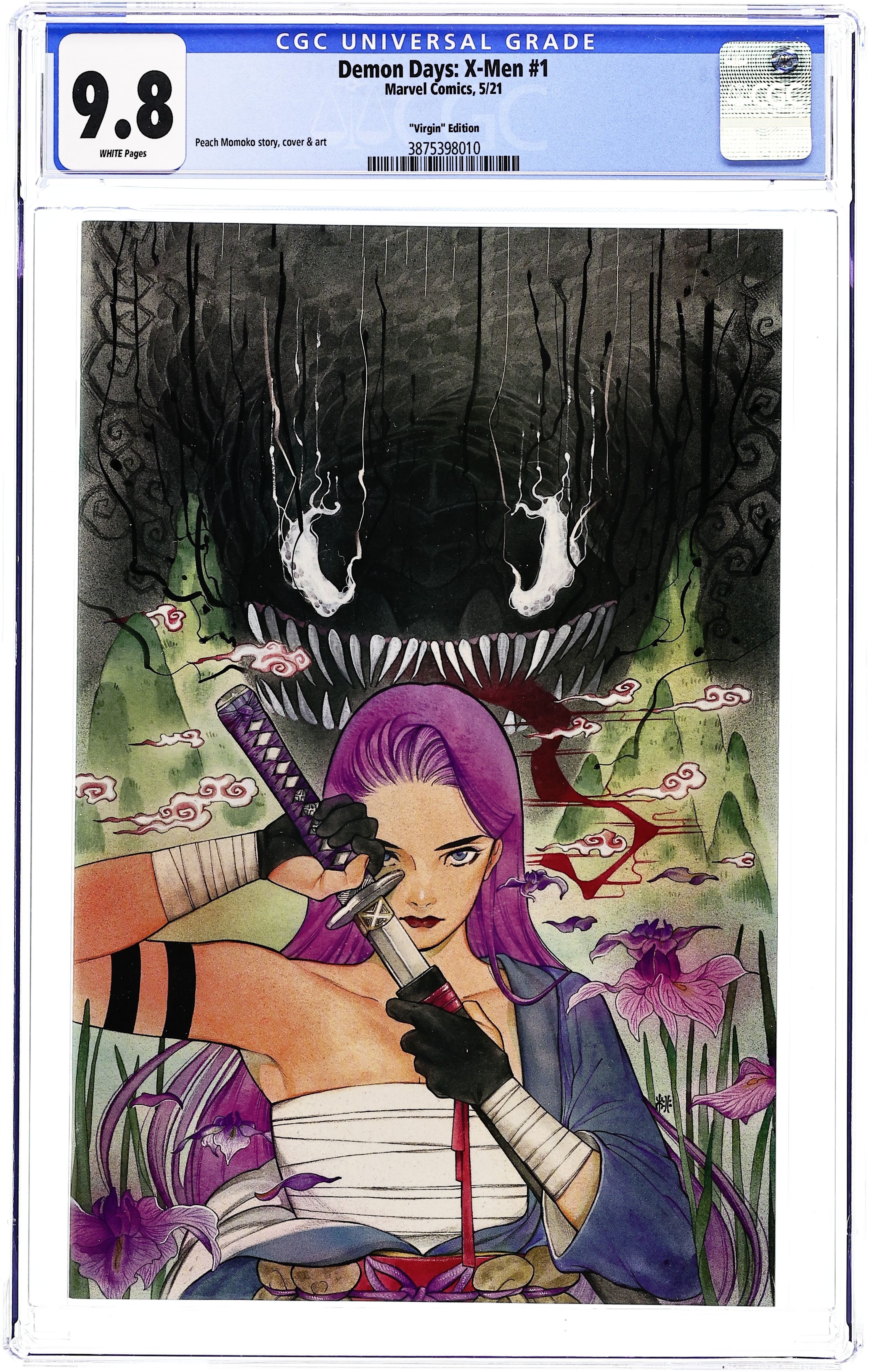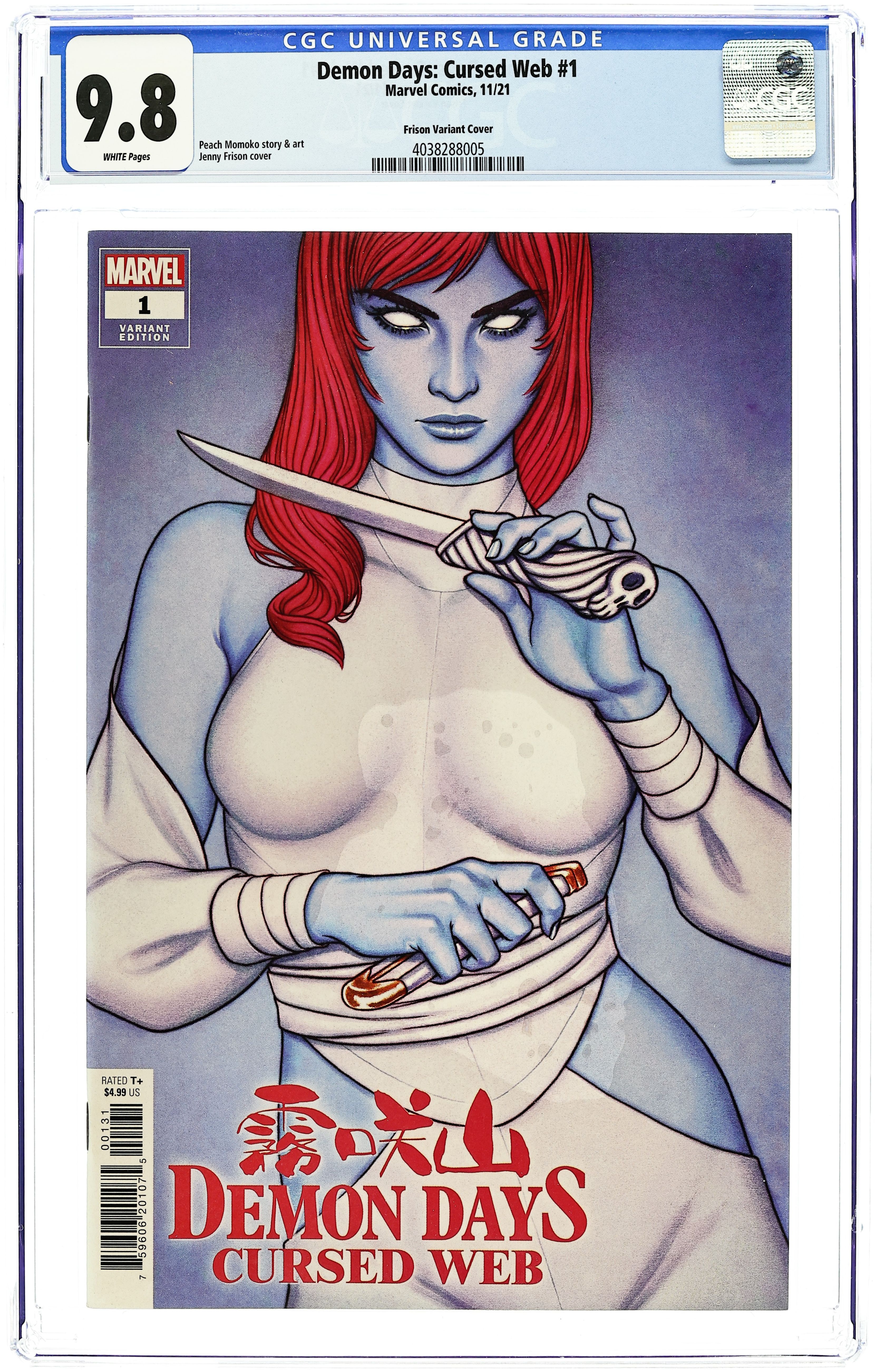 Limited 1 for 50 Retailer Incentive Variant Cover. The Yashida Saga: Prelude - Written and Art by Peach Momoko. Cover by J. Scott Campbell. From STORMBREAKER PEACH MOMOKO comes a Marvel story unlike any you've ever seen before! A wandering swordswoman with a psychic blade arrives at village that's being targeted by demons. One demon is black and white with a terrifying red tongue and another may be the strongest demon there is! In the stunning kick-off issue of this prestige quarterly story, you'll see a revolutionary reimagination of the Marvel Universe that could only come from Peach Momoko. Ready your katana and enter a mysterious world of demons, monsters, mutants, and magic! Book ONE of FIVE of the DEMON DAYS saga! 36 pages, full color. Rated T+ Cover price $4.99.