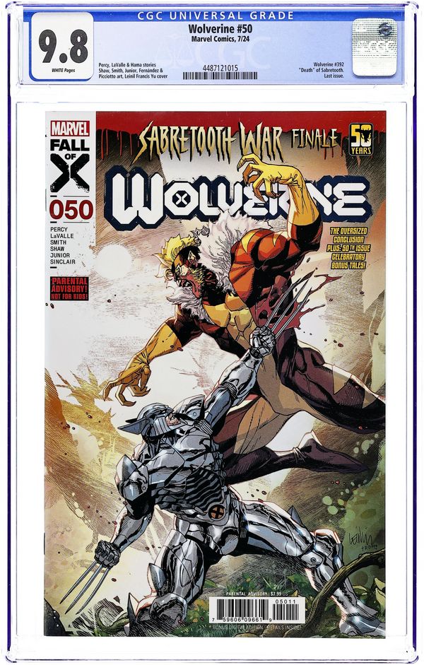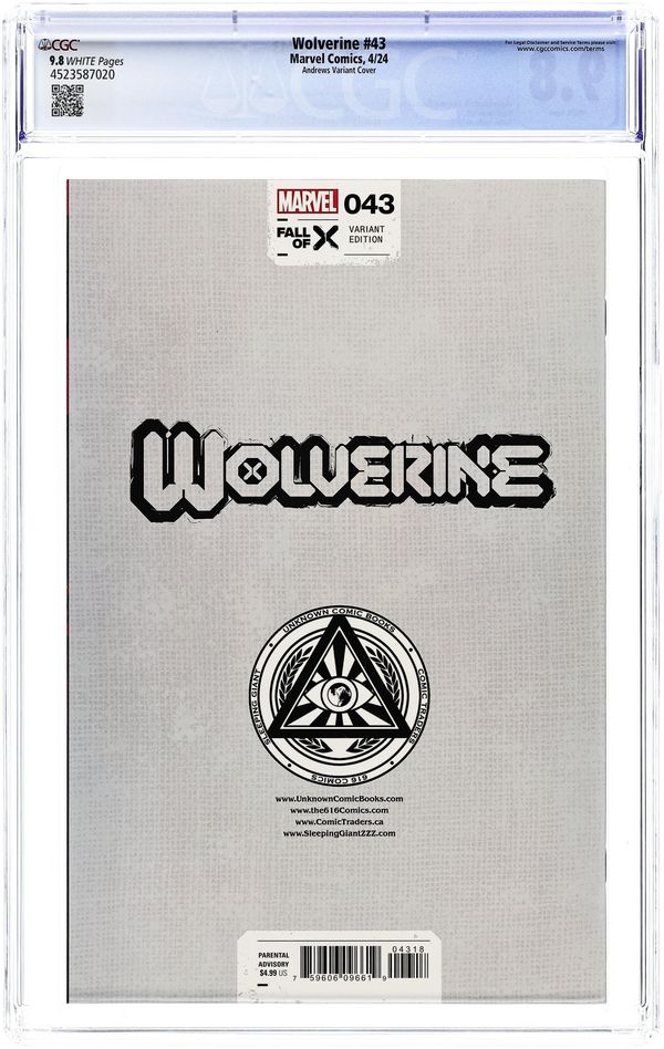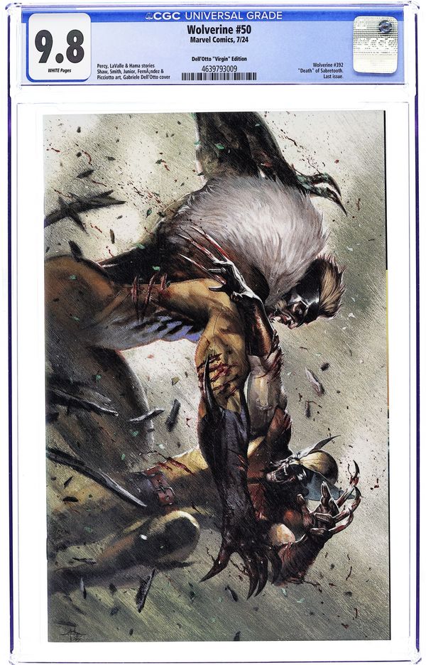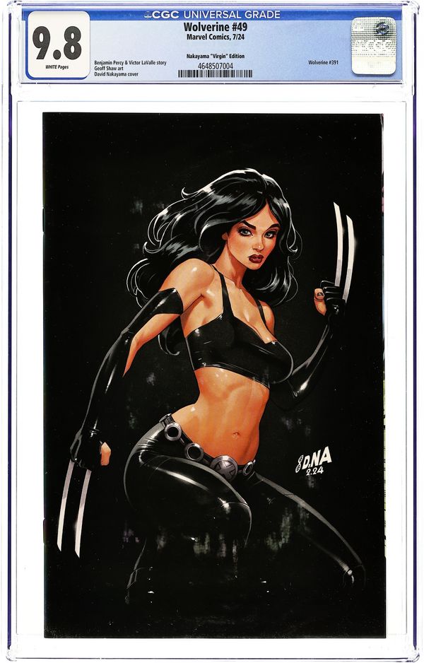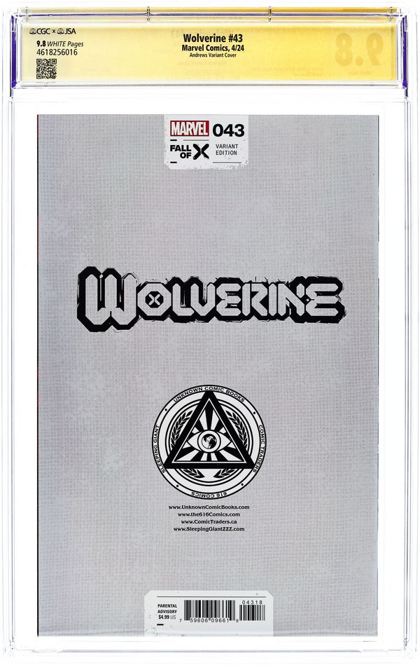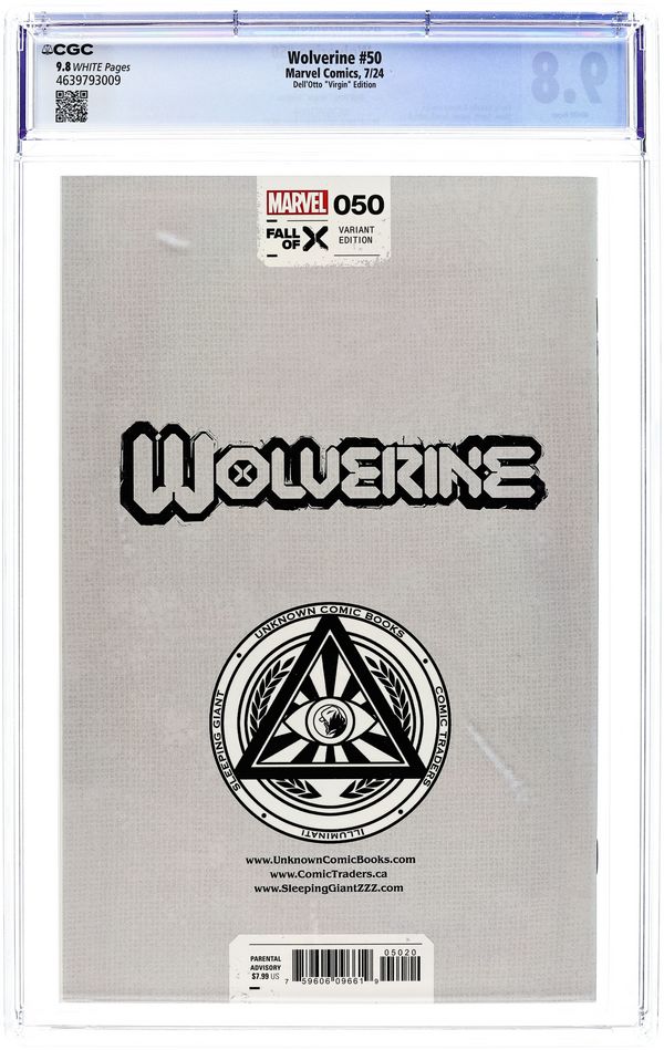 Comics Illuminati (Unknown Comics, Street Level Hero, Comic Traders, Anti-Hero Gallery, and The 616 Comics) Exclusive Virgin Cover by Nathan Szerdy. Written by Benjamin Percy. Art by Ibrahim Moustafa. STARK SENTINELS GET SPIDER-SENSES TINGLING! LAST MUTANT STANDING - FINALE! LOGAN's journey across the ORCHIS-controlled globe brings him to New York City - and a reunion with that great non-mutant super hero: SPIDER-MAN! But will the ol' PARKER LUCK help WOLVERINE against the wrath of the STARK SENTINELS or put the fall in FALL OF X?! 32 pages, full color. Rated Parental Advisory