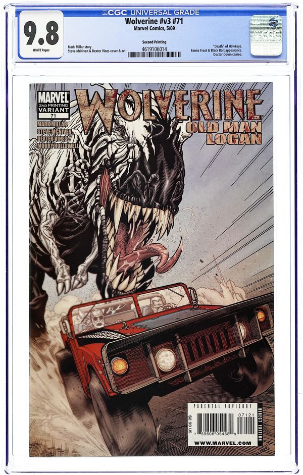 2nd Printing Variant Cover by STEVE MCNIVEN. Old Man Logan: Part 1 of 8 - Written by MARK MILLAR Pencils by STEVE MCNIVEN. MARK MILLAR and STEVE MCNIVEN-who last teamed for the monumental CIVIL WAR-bring us the most important WOLVERINE story of the 21st Century. Nobody knows what happened on the night the heroes fell. All we know is that they disappeared and evil triumphed and the bad guys have been calling the shots ever since. What happened to Wolverine is the biggest mystery of all. For 50 years, no one has heard hide nor hair from him...and in his place stands an old man called Logan. A man concerned only about his family. A man pushed to the brink by the HULK GANG. A man forced to help an old friend-the blind archer, HAWKEYE-to drive three thousand miles to secure his family's safety. Get ready for the ride of your life, Logan. 32 PGS./Parental Advisory NOTE: This story plus Fantastic Four (1998- 3rd Series) #558-561 and Marvel 1985 (2008) #1-5 are all part of an epic past, present, and future storyline written by Mark Millar that all ties in together. - Odinson, Lone Star Comics Archivist Cover price $2.99.