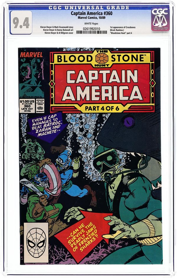 Direct Edition. "Blood in the Sea" Part 4 of 6. Story by Mark Gruenwald and Kieron Dwyer. Art by Kieron Dwyer and Danny Bulanadi. Cover by Kieron Dwyer and Al Milgrom. Off the Bermuda shore, an undersea battle is in progress among Captain America, Batroc, Machete, and Zaran; when suddenly a school of sharks decides to join the action! Meanwhile, Diamondback sneaks on board Baron Zemo's yacht and pilfers two of the bloodstone jewels. At the end of the day, Cap and Diamondback have two of the five bloodstone jewels and Baron Zemo has one. The hunt for the remaining two continues in Egypt. First appearance of Crossbones. Back up story: "Conflagration" Part 3 of the Night of the Scourge. Story by Mark Gruenwald. Art by Mark Bright and Don Hudson. The U.S. Agent battles Scourge, but only one of them will be left standing by night's end! 36 pgs. Cover price $1.00.