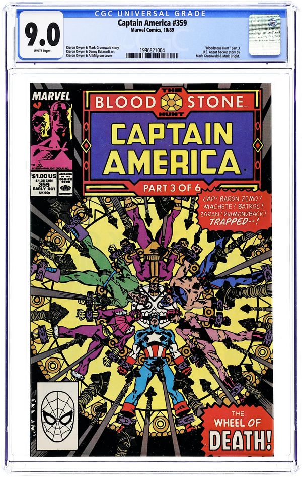 Direct Edition. "Wheel of Death" Part 3 of 6. Story by Mark Gruenwald and Kieron Dwyer. Art by Kieron Dwyer and Danny Bulanadi. Cover by Kieron Dwyer and Al Milgrom. Captain America, Diamondback, Baron Zemo, Batroc, Machete, and Zaran are prisoners of a lost tribe of Incans! Now all six captives are strapped to the wheel of death. It's going to take an incredible effort from the star-spangled avenger to save both the heroes and the villains. Back up story: "Death Calling" Part 2 of the Night of the Scourge. Story by Mark Gruenwald. Art by Mark Bright and Don Hudson. The U.S. Agent arrives at the Power Broker's home, and he has his sights set on Scourge! 36 pages Cover price $1.00.
