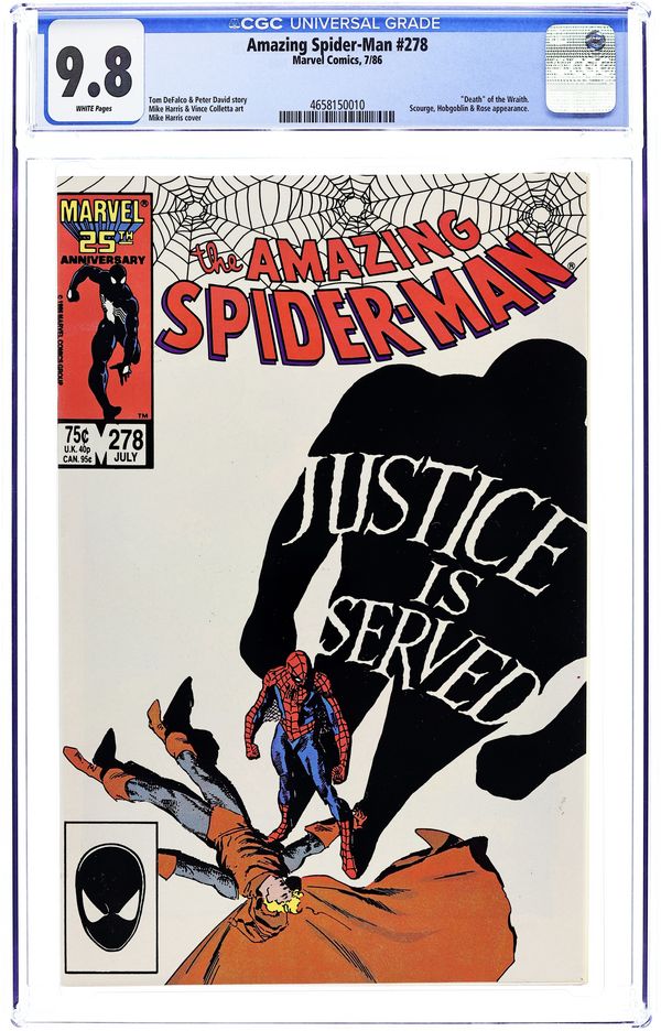 Direct Edition. "If This Be Justice" Plot by Tom DeFalco. Script by Peter David and Mary Jo Duffy. Pencils by Mike Harris. Inks by Vince Colletta. Cover by Mike Harris. Still reeling from the revelation that Flash Thompson might be the Hobgoblin, Peter Parker walks to the police station to visit his friend. Aunt May's nephew thinks that Flash may be innocent. But someone else walking to police station already thinks he's guilty! The Scourge of the Underworld! Oh no! Oh yes, from the pages of Captain America's title...the gun-toting vigilante is ready to bring justice to the Hobgoblin! Whether he's got the right one or not! When Scourge enters the police station, justice is indeed served! But to whom? Flash, Scourge, or your friendly neighborhood Spider-Man! Cameo appearances by the Rose, Hobgoblin, and the Wraith (aka Brian DeWolff). (Notes: The striking cover to this issue is unsigned -- possible pencils by Charles Vess or Mike Harris with inks by Kyle Baker. This issue was reprinted in Marvel Tales 286.) 36 pages. Cover price $0.75.