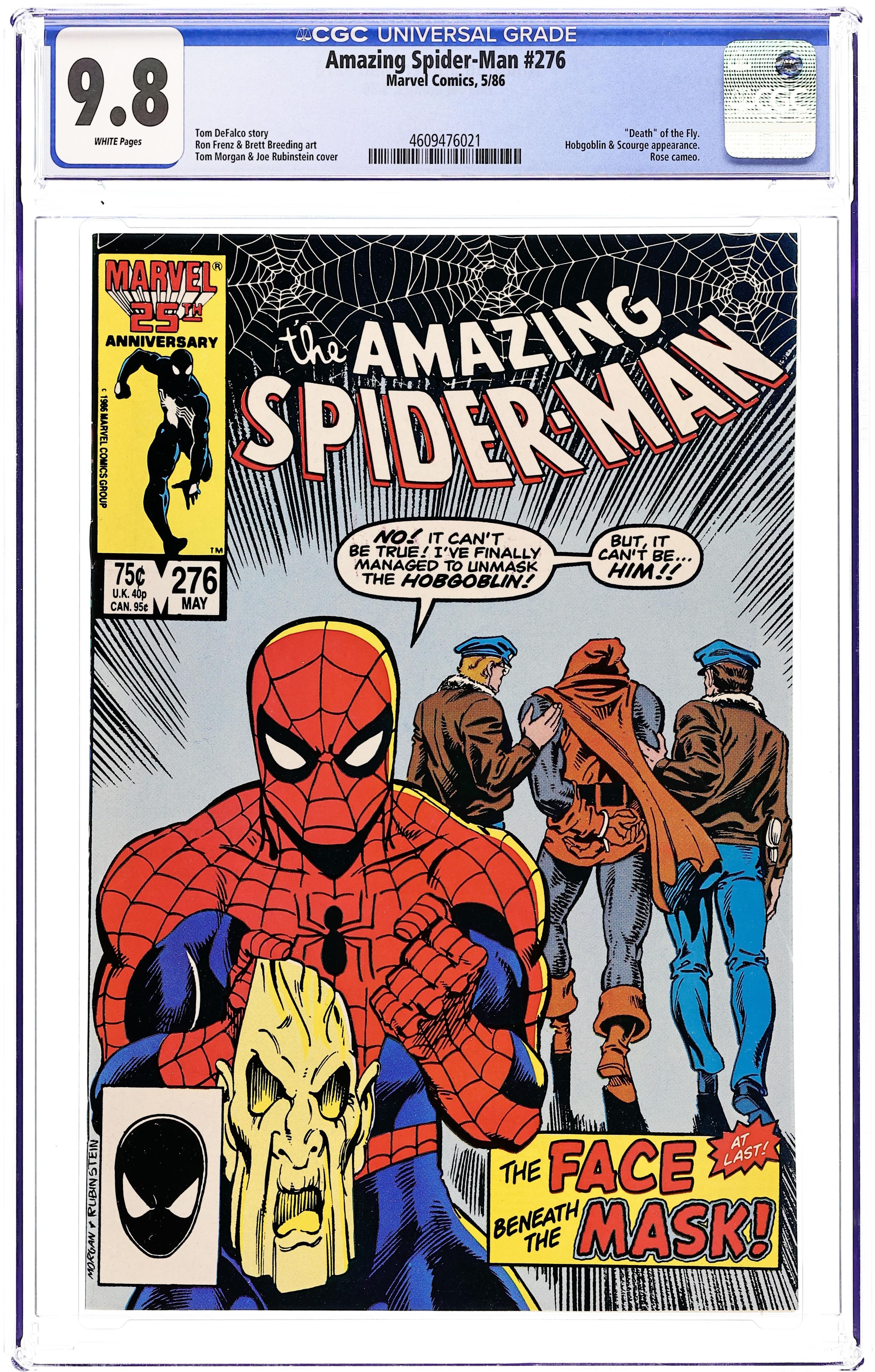 Direct Edition. "Unmasked!" Part 2 of 2. Script by Tom DeFalco. Pencils by Ron Frenz. Inks by Brett Breeding. Cover by Tom Morgan and Joe Rubinstein. After rescuing Sha Shan, the wondrous wall-crawler roughs up the Hobgoblin! And sends the crazy villain gliding away to lick his wounds! However the goblin makes good use of his downtime and develops a new scheme...to win by losing! When Spider-Man and the Hobgoblin clash again, an explosion knocks the goblin unconscious! And it appears that the web-slinger has finally won! The wall-crawler can't wait to unmask the goblin! But once he does...he gets the shock of his life! Is the Hobgoblin really one of his best friends? Appearances by the Rose, Human Fly (aka Fearsome Fly), the Scourge of the Underworld, Mary Jane Watson, and Flash Thompson. (Note: This issue was reprinted in Marvel Tales 284.) 36 pages Cover price $0.75.