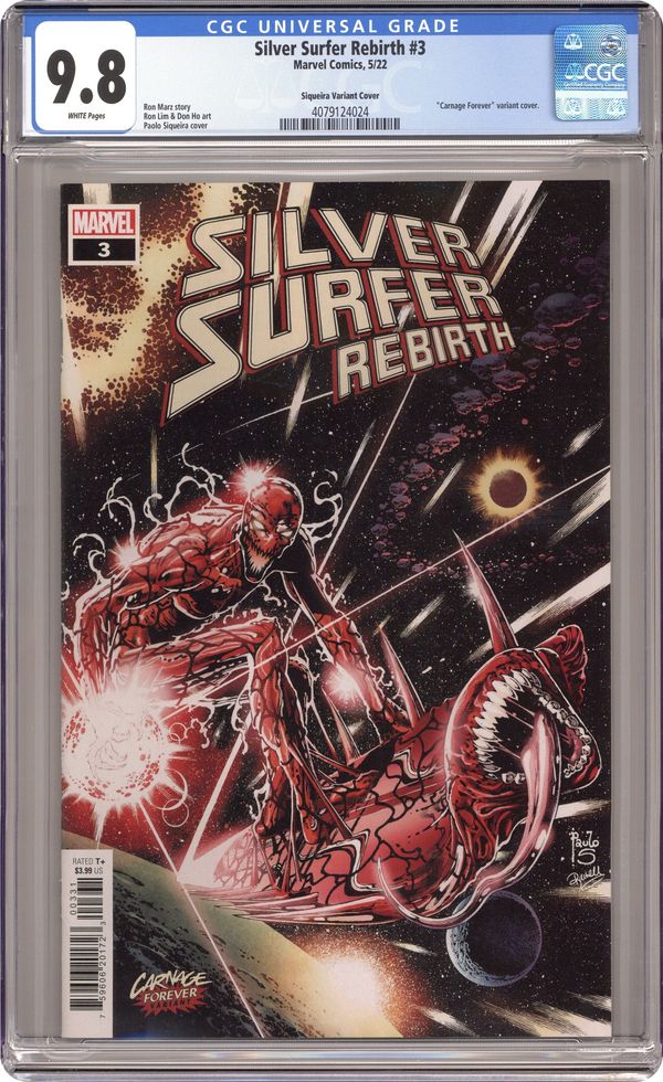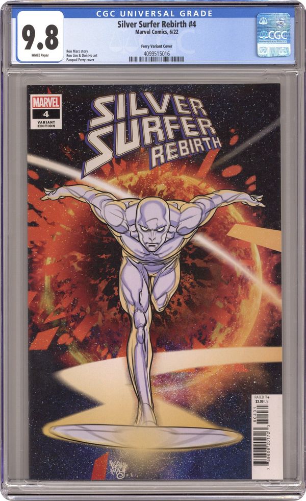 Written by Ron Marz. Art by Ron Lim. Cover by Paolo Siqueira. The Silver Surfer has stumbled into a reality with a blast from the past. Master and servant are reunited, and it's not going to be a happy one. 28 pages, full color. Rated T+ 28 pages, full color. Rated T+ Cover price $3.99.