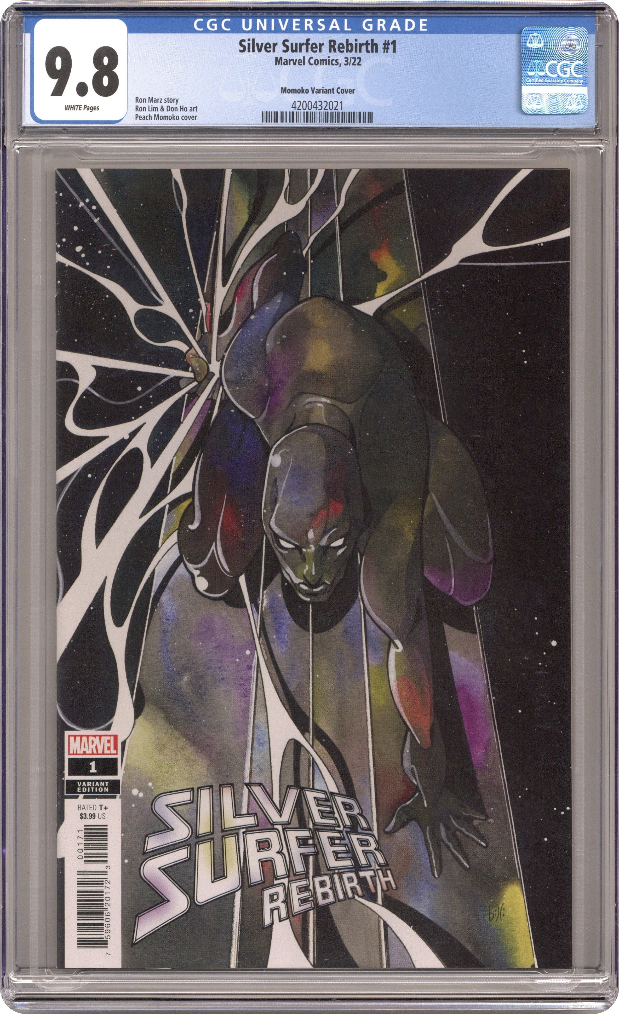Written by Ron Marz. Art by Ron Lim. Cover by Peach Momoko. THEY'RE BACK! No, we don't mean the guys on the cover… We're talking about legendary creators Ron Marz and Ron Lim returning to tell a story set during their fan-favorite run of SILVER SURFER! Someone has stolen the Reality Gem, an object that allows the user to fulfill any wish no matter the consequences! But whoever has taken it is doing things like bringing back the dead hero Captain Mar-Vell. It's up to Silver Surfer to team up with the least likely of allies, Thanos, to find the Gem and restore reality to its proper form. 28 pages, full color. Rated T+ Cover price $3.99.