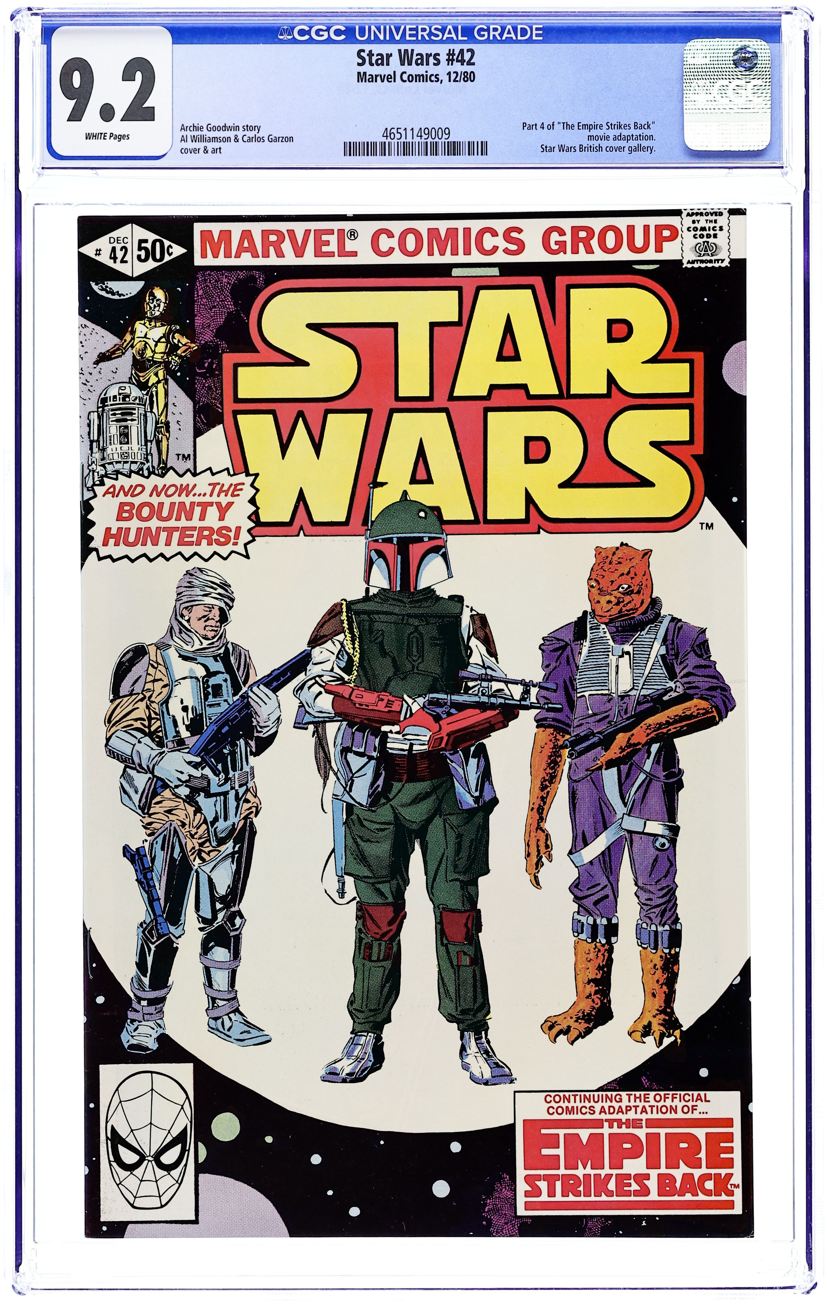 Direct Edition. The Empire Strikes Back: Part 4 of 6. And now...the bounty hunters! "To Be a Jedi!" Script by Archie Goodwin, art by Al Williamson and Carlos Garzon. Note: Part 4 of movie adaptation; based on the movie script; Williamson and Garzon both pencil and ink the art for this series. Plus: 5-page "Star Wars British Cover Gallery," featuring art by Carmine Infantino, Gene Day and Dan Green. Cover by Williamson and Garzon. Cover price $0.50.
