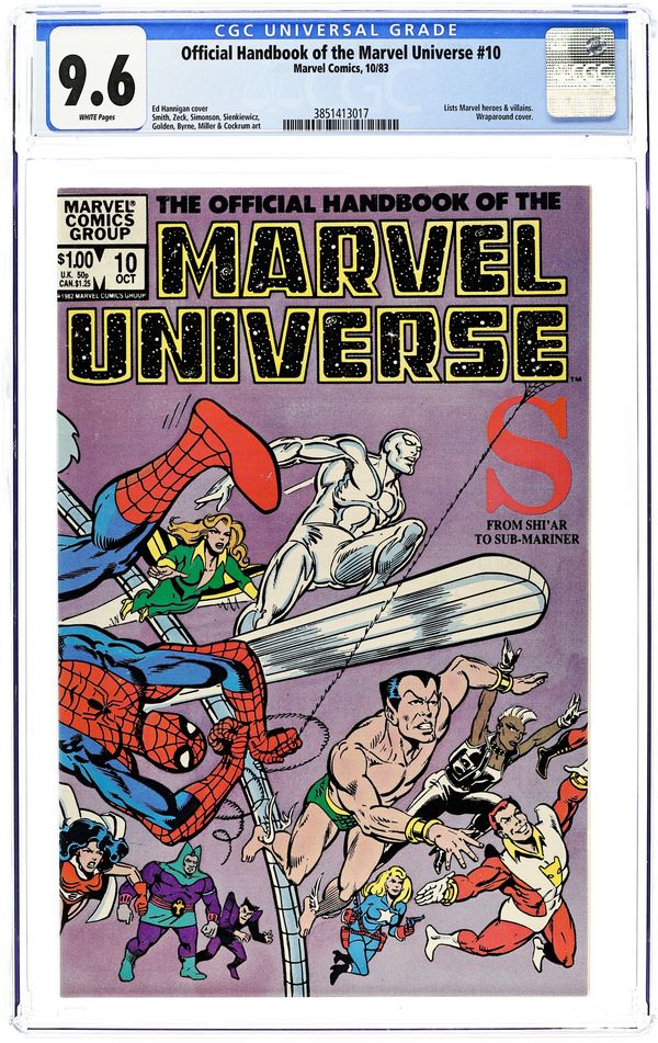 The Official Handbook of the Marvel Universe is a meticulously detailed, alphabetically arranged series of reference volumes that provides data (such as biographical info, weapons, and powers) for countless Marvel characters, both popular and obscure, both new (circa 1983) and old. Issue #10 includes entries ranging from Shi'ar to Sub-Mariner, with Silver Surfer, Skrulls, Spider-Man, Storm, and others in between. Pages by Paul Smith, Mike Zeck, Walt Simonson, Bill Sienkiewicz, Kerry Gammill, Michael Golden, John Byrne, Frank Miller, Jim Starlin, Dave Cockrum, and Butch Guice Cover price $1.00.