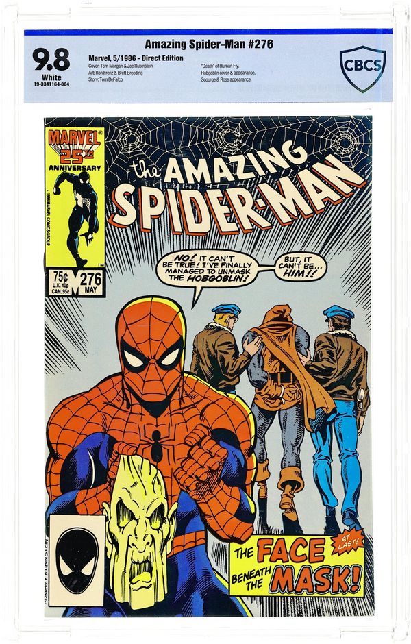 Direct Edition. "Unmasked!" Part 2 of 2. Script by Tom DeFalco. Pencils by Ron Frenz. Inks by Brett Breeding. Cover by Tom Morgan and Joe Rubinstein. After rescuing Sha Shan, the wondrous wall-crawler roughs up the Hobgoblin! And sends the crazy villain gliding away to lick his wounds! However the goblin makes good use of his downtime and develops a new scheme...to win by losing! When Spider-Man and the Hobgoblin clash again, an explosion knocks the goblin unconscious! And it appears that the web-slinger has finally won! The wall-crawler can't wait to unmask the goblin! But once he does...he gets the shock of his life! Is the Hobgoblin really one of his best friends? Appearances by the Rose, Human Fly (aka Fearsome Fly), the Scourge of the Underworld, Mary Jane Watson, and Flash Thompson. (Note: This issue was reprinted in Marvel Tales 284.) 36 pages Cover price $0.75.