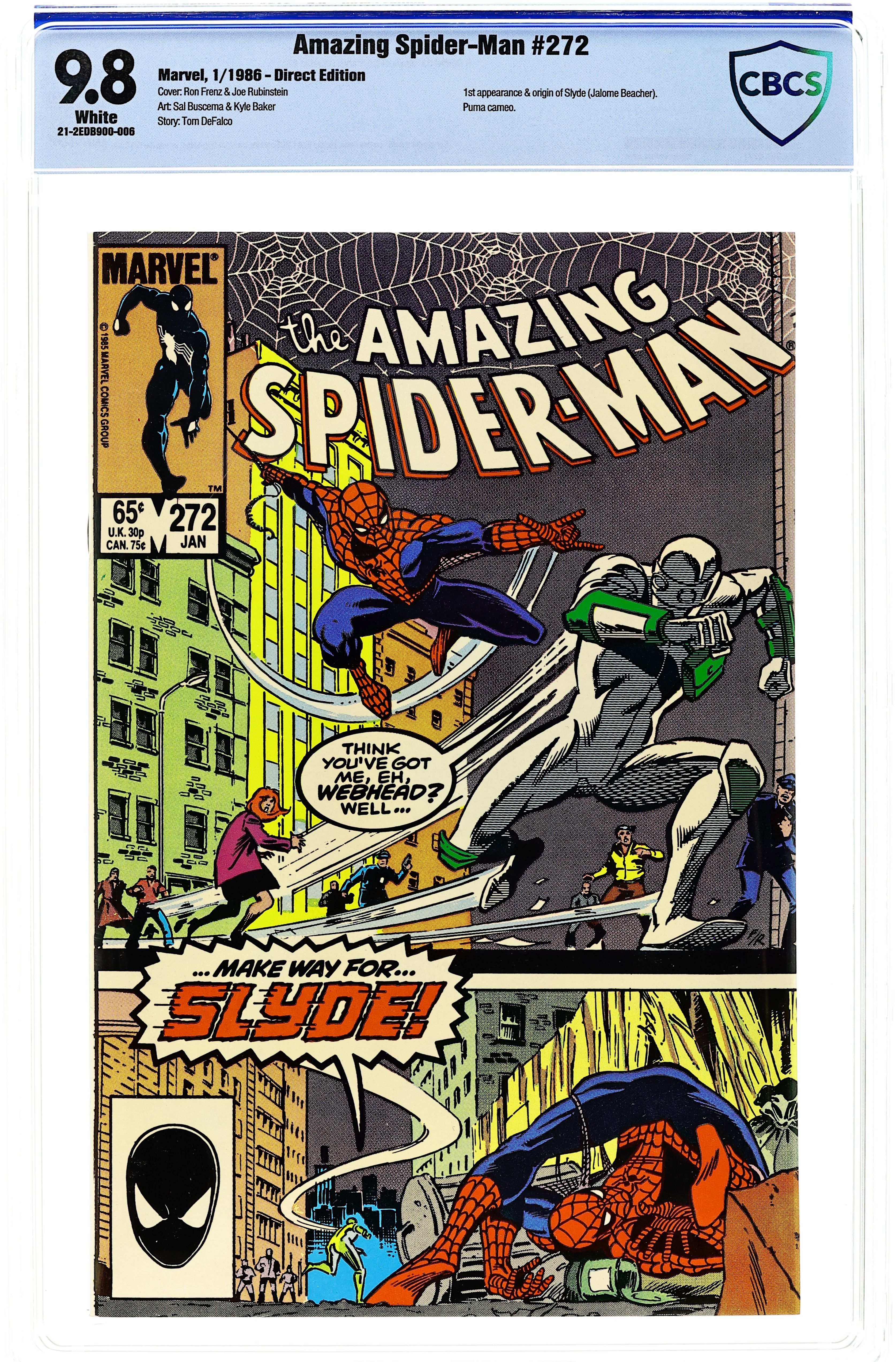 Direct Edition. "Make Way for Slyde!" Script by Tom DeFalco. Pencils by Sal Buscema. Inks by Kyle Baker. Cover by Ron Frenz and Joe Rubinstein. A new sleek and savvy super-villain bursts onto the scene! Slyde! And this guy is slipperier than a greased pig! When the teflon-coated speedster robs a bank, he garners the attention of the wondrous wall-crawler! But even Spidey can't lay a glove on him! Can anyone stop (the) Slyde? First appearance and origin of Slyde. Cameo appearance by Puma. Last 65ยข issue. (Notes: Slyde returns in Web of Spider-Man 23. Kyle Baker's inks over Sal Buscema's pencils create a very distinctive look. This story was reprinted in Marvel Tales 282.) 36 pages. Cover price $0.65.
