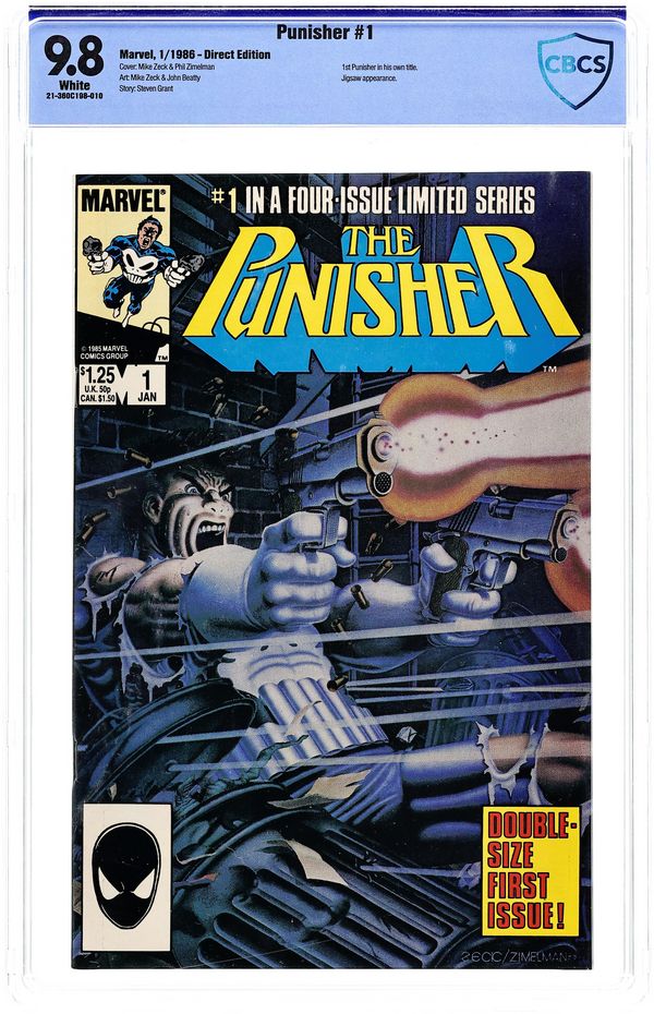 Direct Edition. "Circle of Blood!" Story by Steven Grant. Art by Mike Zeck and John Beatty. Cover by Mike Zeck and Phil Zemelman. After a drug-induced bloody rampage, Frank Castle finds himself behind bars. When he discovers his old enemy Jigsaw, a criminal with a severely scarred face, is responsible, the Punisher sets out to do what he does best. Cover price $1.25.