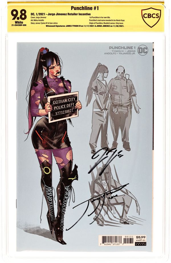 Limited 1 for 25 Retailer Incentive Variant Cover. Written by James Tynion TV and Sam Johns. Art by Mirka Andolfo. Cover by Jorge Jimenez. Spinning out of the pages of The Joker War comes the first solo book starring the blockbuster new character Punchline. As she faces the consequences for her role in The Joker War, the story of how Alexis Kaye became Punchline will take Leslie Thompkins, Harper Row, and Cullen Row on a harrowing journey that reveals a fringe teenagers radicalization to the ideology of a madman. Its a terrifying tale so big it demanded an oversize special issue! 48 pages, full color. Rated T+ Cover price $5.99.