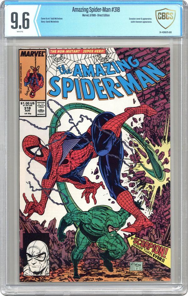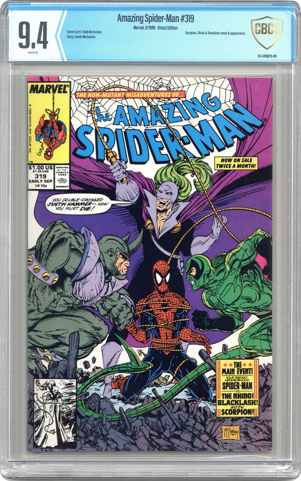 Direct Edition. "Sting Your Partner!" Part 1 of 2. Script by David Michelinie. Art by Todd McFarlane. Cover by Todd McFarlane. With new armament from Justin Hammer, the sinister Scorpion is back in business! But before Mac Gargan can resume his personal agenda, he has to do a job for Mr. Hammer! Fortunately, it's a fairly simple one: kidnap an army general from the Brooklyn National Guard Armory and hand him over to Hammer Industries! However, both Lance Bannon and the wondrous wall-crawler are also at the armory taking pictures for the Daily Bugle! When the Scorpion hears the name of the hated J. Jonah Jameson, he decides to go off-script! And he will regret that decision...post-haste! Cameo appearances by Mary Jane Watson, Harry Osborn, and the Chameleon. (Note: The Scorpion previously appeared in Amazing Spider-Man Annual 18.) 36 pages. Cover price $1.00.
