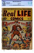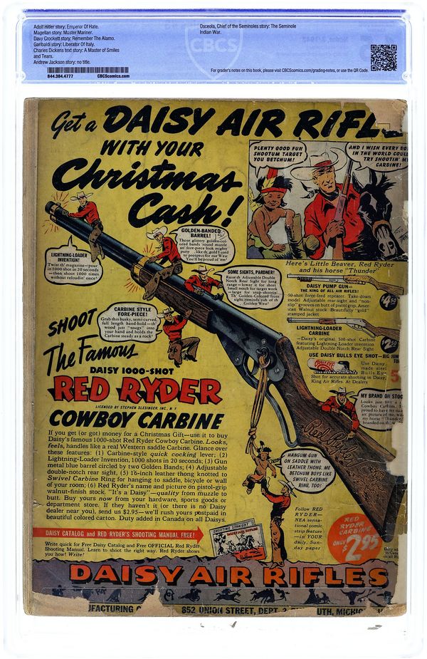 "Adolf Hitler: Emperor of Hate;" The Bloody Trail of the German Fuehrer leads along a route that can only end in his defeat and death. "Magellan: Master Mariner;" The explorers vision encompassed the globe, and his ships sailed to its furthest corners. "Remember the Alamo," script by Maurice Gutwirth; Davy Crockett, William B. Travis, James Bowie and their Texas pioneers write a glorious page in American history. "Garibaldi: Liberator of Italy;" The great Italian patriot believed in freedom and unselfishness, and was willing to lay down his life for them. "A Master of Smiles and Tears" text story; The amazing career of Charles Dickens, whose writings influenced social progress in England and America. "Andrew Jackson;" Old Hickory came out of the South to lead his country's soldiers and become one of America's great presidents. "The Seminole Indian War;" Osceola, chief of the Seminoles learns that the settlement of the Florida peninsula makes the natives a pawn in International intrigue. 68 pgs., full color. $0.10. Cover price $0.10.