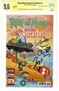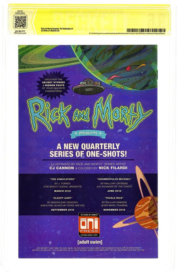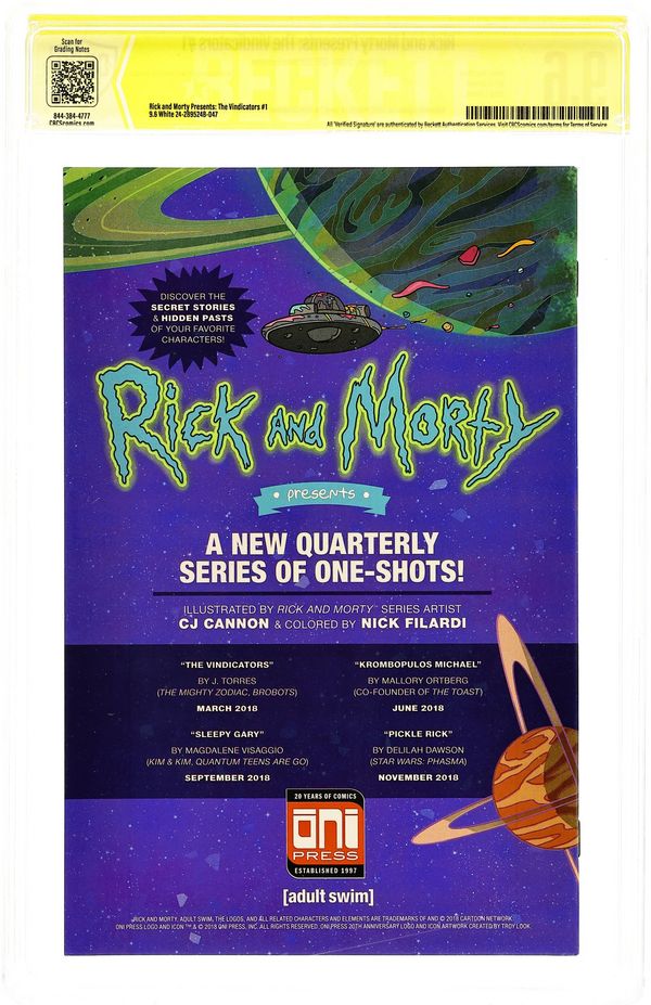 2nd Printing. Written by J. Torres. Art and Cover by CJ Cannon and Nick Filardi. Learn the secret stories and hidden pasts of your favorite Rick and Morty characters in Oni Press's new quarterly series of one-shots: RICK AND MORTY PRESENTS! In this first issue, J. Torres (Teen Titans Go!, The Mighty Zodiac) teams up with Rick and Morty series artist CJ Cannon to explore the twisted and bombastic history of THE VINDICATORS in an all-out superhero comics extravaganza. Read in amazement as the superhero team travels through dimensions to recruit other heroes to defeat a villain of their own making. Gasp in shock and awe as the plot twists and previously irrelevant characters revive from the dead! Frown in frustration as you forget the complicated backstory of suddenly important mythic items! 36 pages, full color. Cover price $4.99.