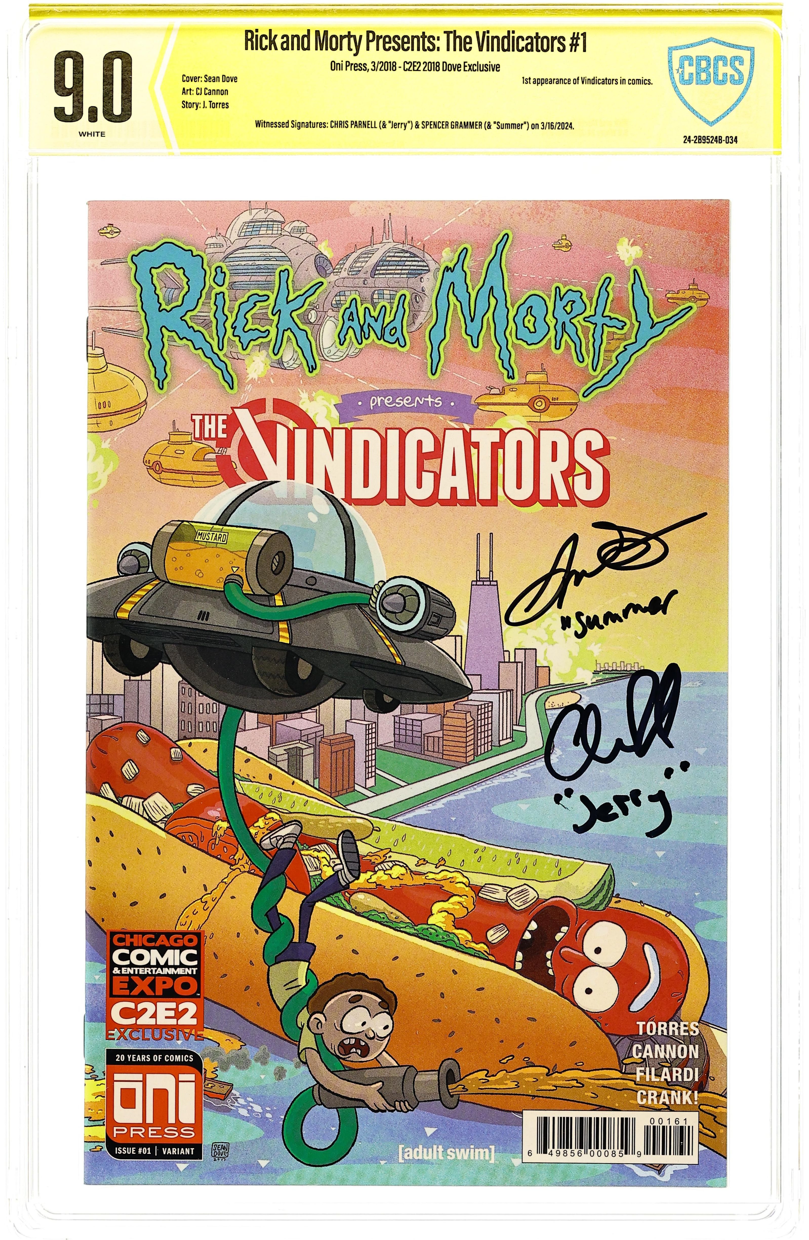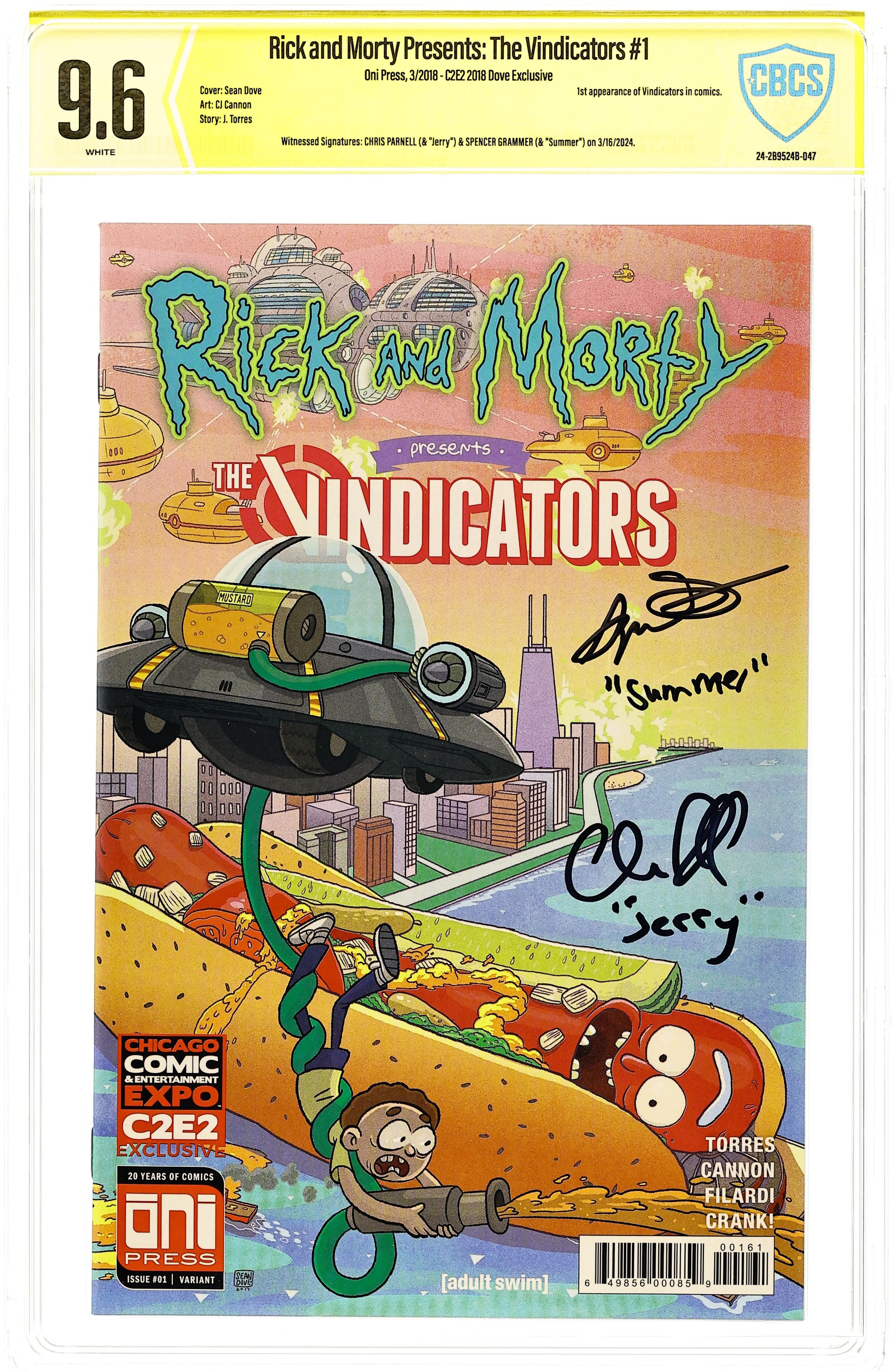 C2E2(Chicago Comic and Entertainment Expo) Exclusive Variant cover by Sean Dove. Written by J. Torres. Art by CJ Cannon and Nick Filardi. Learn the secret stories and hidden pasts of your favorite Rick and Morty characters in Oni Press's new quarterly series of one-shots: RICK AND MORTY PRESENTS! In this first issue, J. Torres (Teen Titans Go!, The Mighty Zodiac) teams up with Rick and Morty series artist CJ Cannon to explore the twisted and bombastic history of THE VINDICATORS in an all-out superhero comics extravaganza. Read in amazement as the superhero team travels through dimensions to recruit other heroes to defeat a villain of their own making. Gasp in shock and awe as the plot twists and previously irrelevant characters revive from the dead! Frown in frustration as you forget the complicated backstory of suddenly important mythic items! 36 pages, full color.