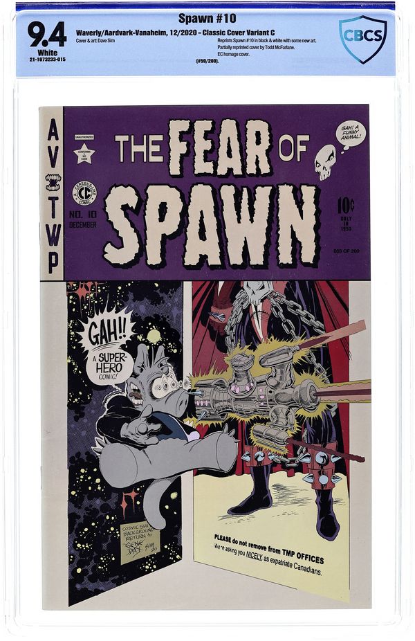 Classic Cover C variant - Limited to 200 copies. A 48 page deluxe, expanded edition with updated art, new covers, and rarities! Cover by Todd McFarlane, Dave Sim, Benjamin Hobbs. Story by Dave Sim. Art by Todd McFarlane, Dave Sim. "Crossing Over!" Guest-starring Cerebus. Todd Mcfarlane's masterful inking style radically changed the aesthetics of comic-books forever. Transforming the 1980s homogeneous bullpen style of the Big 2 to the hyper-dynamic style that dominates the modern era. McFarlane's loose, detailed, energetic art alongside Sims cartoon realism brush and line work highlights the power of each artist in the pages of this new edition of SPAWN No. 10! Still as fresh and relevant today as when it first appeared, Dave Sim and Aardvark-Vanaheim have partnered with The Waverly Press to present Sim's new modified version of this classic tale published nearly three decades ago, expanded with new content and rarities from this comics milestone. While the original edition of SPAWN No. 10 was published in full color, this special edition - at Dave Sims insistence - presents the story in black and white. In the original edition, McFarlane drew what Dave Sim has called the definitive Cerebus (...more people saw Todds Cerebus that one month than had seen my Cerebus in the decade prior to SPAWN No. 10). "Remastered" pages with Dave Sim's new art! Working gingerly and painstakingly around his career-ending (2015) wrist ailment, Sim fulfilled what he calls a last ambition to render the Kitchener Sequence as he originally pictured it. He also redrew the Cerebus figures throughout the issue. B&W. 48pgs.