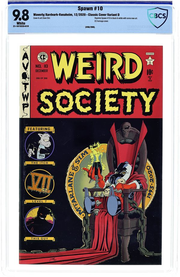 Classic Cover D variant - Limited to 200 copies. A 48 page deluxe, expanded edition with updated art, new covers, and rarities! Cover by Dave Sim, David Birdsong. Story by Dave Sim. Art by Todd McFarlane, Dave Sim. "Crossing Over!" Guest-starring Cerebus. Todd Mcfarlane's masterful inking style radically changed the aesthetics of comic-books forever. Transforming the 1980s homogeneous bullpen style of the Big 2 to the hyper-dynamic style that dominates the modern era. McFarlane's loose, detailed, energetic art alongside Sims cartoon realism brush and line work highlights the power of each artist in the pages of this new edition of SPAWN No. 10! Still as fresh and relevant today as when it first appeared, Dave Sim and Aardvark-Vanaheim have partnered with The Waverly Press to present Sim's new modified version of this classic tale published nearly three decades ago, expanded with new content and rarities from this comics milestone. While the original edition of SPAWN No. 10 was published in full color, this special edition - at Dave Sims insistence - presents the story in black and white. In the original edition, McFarlane drew what Dave Sim has called the definitive Cerebus (...more people saw Todds Cerebus that one month than had seen my Cerebus in the decade prior to SPAWN No. 10). "Remastered" pages with Dave Sim's new art! Working gingerly and painstakingly around his career-ending (2015) wrist ailment, Sim fulfilled what he calls a last ambition to render the Kitchener Sequence as he originally pictured it. He also redrew the Cerebus figures throughout the issue. B&W. 48pgs.
