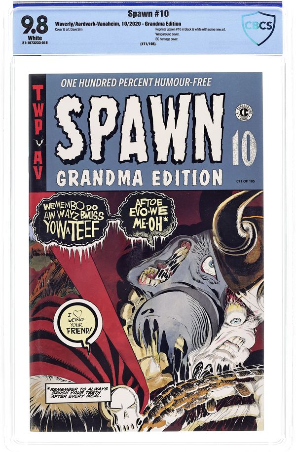 Grandma Edition - Limited to 195 copies. Censored Edition. A 48 page deluxe, expanded edition with updated art, new covers, and rarities! Cover by Dave Sim, David Birdsong. Story by Dave Sim. Art by Todd McFarlane, Dave Sim. "Crossing Over!" Guest-starring Cerebus. Todd Mcfarlane's masterful inking style radically changed the aesthetics of comic-books forever. Transforming the 1980s homogeneous bullpen style of the Big 2 to the hyper-dynamic style that dominates the modern era. McFarlane's loose, detailed, energetic art alongside Sims cartoon realism brush and line work highlights the power of each artist in the pages of this new edition of SPAWN No. 10! Still as fresh and relevant today as when it first appeared, Dave Sim and Aardvark-Vanaheim have partnered with The Waverly Press to present Sim's new modified version of this classic tale published nearly three decades ago, expanded with new content and rarities from this comics milestone. While the original edition of SPAWN No. 10 was published in full color, this special edition - at Dave Sims insistence - presents the story in black and white. In the original edition, McFarlane drew what Dave Sim has called the definitive Cerebus (...more people saw Todds Cerebus that one month than had seen my Cerebus in the decade prior to SPAWN No. 10). "Remastered" pages with Dave Sim's new art! Working gingerly and painstakingly around his career-ending (2015) wrist ailment, Sim fulfilled what he calls a last ambition to render the Kitchener Sequence as he originally pictured it. He also redrew the Cerebus figures throughout the issue. B&W. 48pgs.