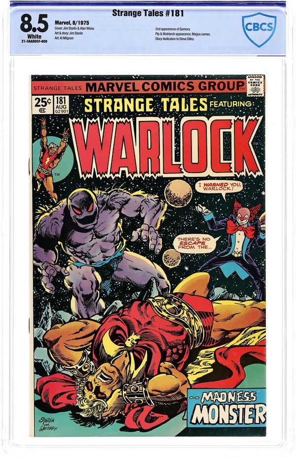 Cover art by Jim Starlin. Warlock begins in this title in "Who Is Adam Warlock?", script and art by Jim Starlin; Sphinxor retells the Origin of Warlock, his encounters with Thor and the High Evolutionary, the Creation of Counter-Earth and Warlock's Battle against the Man-Beast; First appearance of the Magus; Cameo appearances by the Hulk. The story continues from Incredible Hulk 178. 36 pgs., full color. Cover price $0.25.