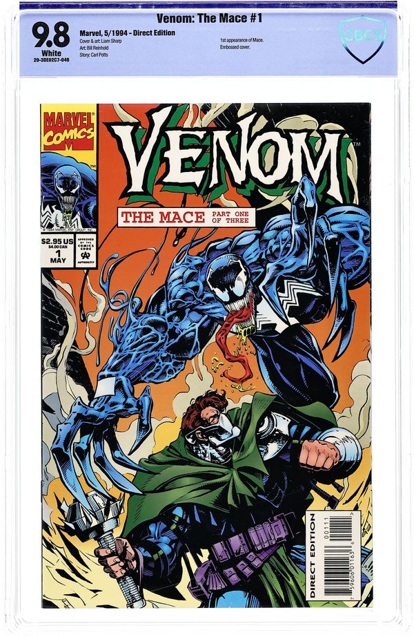 Techno-ninja Mace debuts in this 3-issue limited series, which premieres with a multi-level embossed cover and is printed on glossy stock. When Venom learns that some of the innocents he protects are not what they seem, readers who have questioned Venom's status as a villain will be silenced...especially when he confronts Mace. Written by Carl Potts. Art by Liam Sharp and Bill Reinhold. Cover by Liam Sharp. Cover price $2.95.