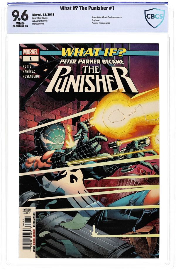 Written by Carl Potts. Art by Juanan Ramirez. Cover by Chris Stevens. WITH GREAT POWER… When Peter Parker's Uncle Ben is ruthlessly killed by a burglar Peter let escape, he vows to never let the same fate befall another innocent bystander. From then on, he stands as a figure of cold retribution. Criminals beware - the guilty caught in this spider's web will be PUNISHED. But will Parker stand triumphant…or shattered by this twist of fate? The friendly neighborhood takes a different turn in this WHAT IF? adventure, positing a very different sense of responsibility for the man who will be known as THE PUNISHER, as his battles against villains like the GREEN GOBLIN take a new path! 28 pages, full color. Rated T+ Cover price $3.99.