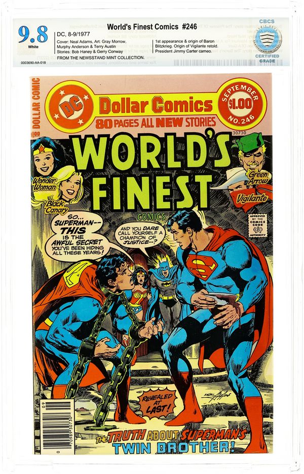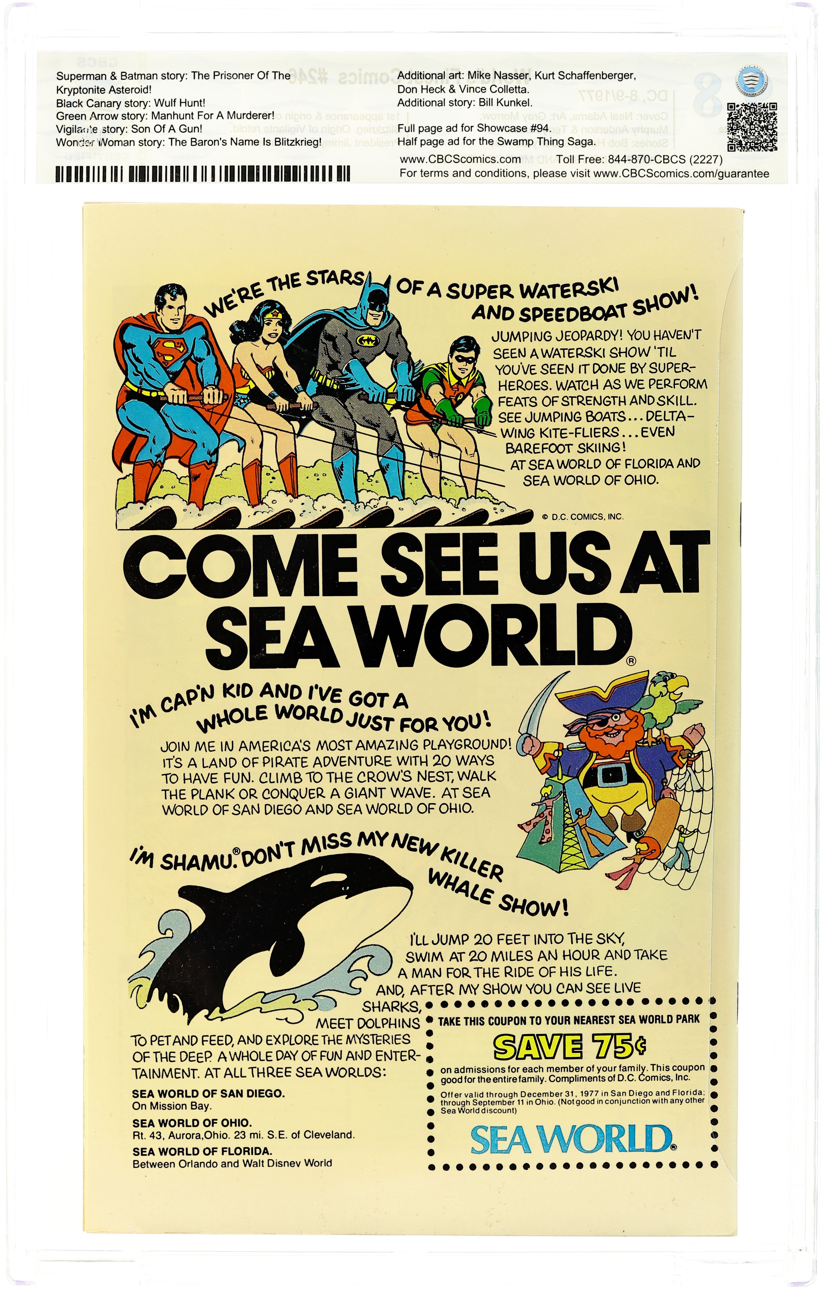 Cover art by Neal Adams. Prisoner of the Kryptonite Asteroid! starring Superman and Batman, script by Bob Haney, pencils by Kurt Schaffenberger, inks by Murphy Anderson; Superman frees a misshapen hunchback called Kor-El from a Kryptonite asteroid. Wulf Hunt starring Black Canary, script by Gerry Conway, pencils by Michael Netzer [as Mike Nasser], inks by Terry Austin. Manhunt for a Murderer starring Green Arrow, script by Gerry Conway, pencils by Terry Austin, inks by Michael Netzer [as Mike Nasser]. Son of a Gun starring The Vigilante, script by Bill Kunkel, art by Gray Morrow. The Baron's Name is Blitzkrieg starring Wonder Woman, script by Gerry Conway, pencils by Don Heck, inks by Vince Colletta. Mike Nasser profile by Jack C. Harris. 84 Pages, Full Color. Cover price $1.00.