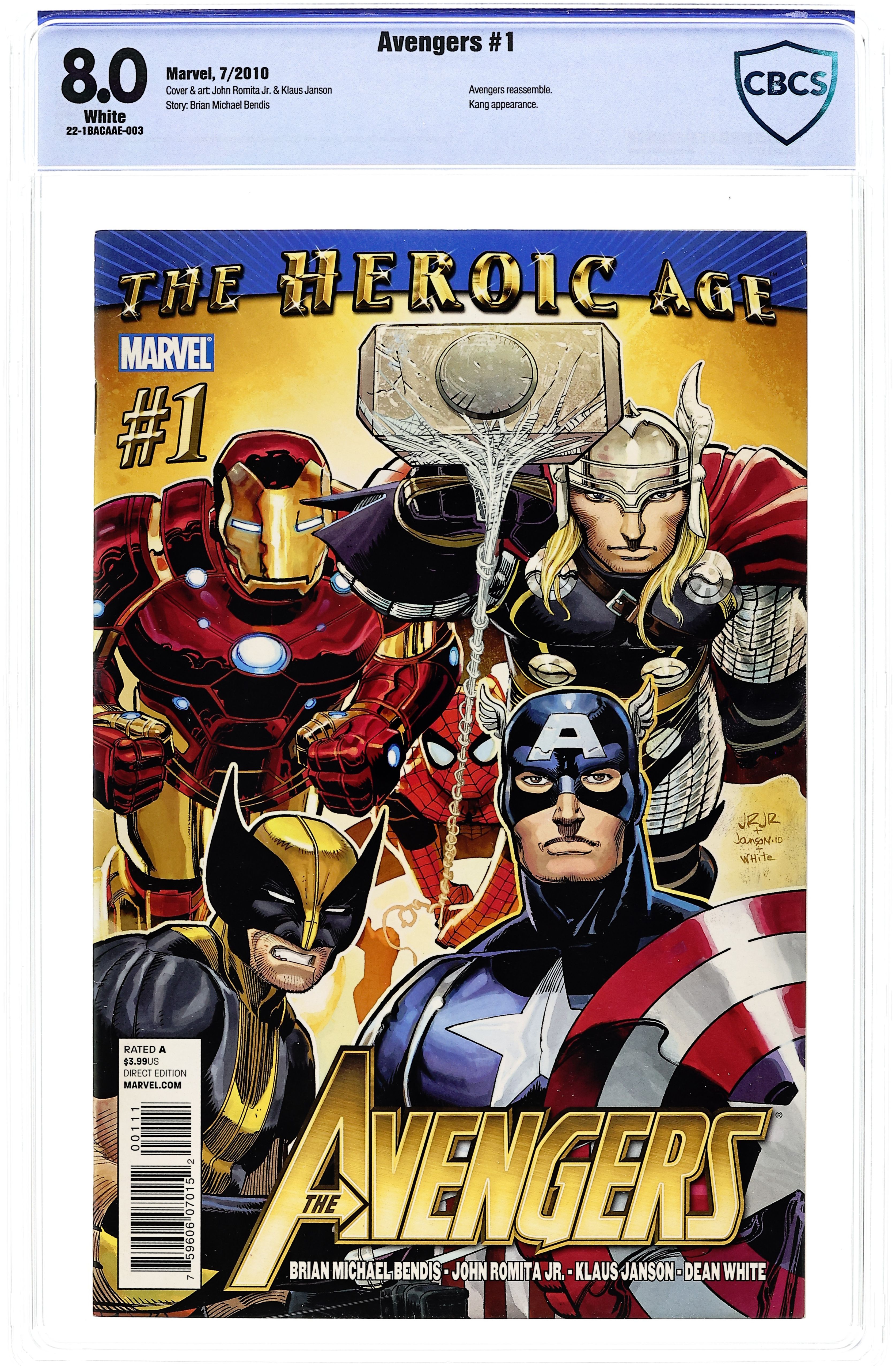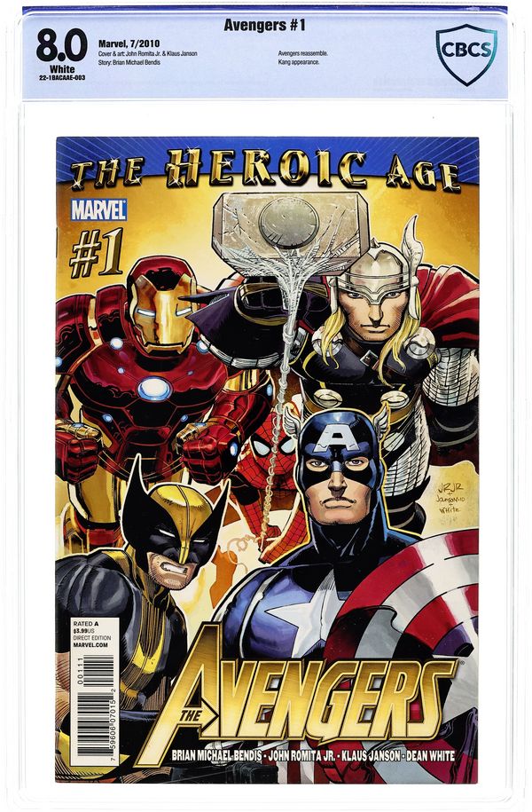 Cover by JOHN ROMITA JR. Written by BRIAN MICHAEL BENDIS Pencils by JOHN ROMITA JR. THE HEROIC AGE IS HERE! There came a day! A day unlike any other...where two of Marvel's top creators teamed up for the very first time to create a bombastic new monthly Marvel comic that not only ushers in the Heroic Age of Marvel Comics but unleashes onto the world the most blockbuster Avengers team ever! Who will answer the call? And will they assemble just in time...because Kang the Conqueror is here from the future. And wait till you find out why...! Bonus back up feature: the oral history of the Avengers, part one. A brand new illustrated look at the Avengers in a way you have never seen before by series writer Brian Michael Bendis. Cover price $3.99.