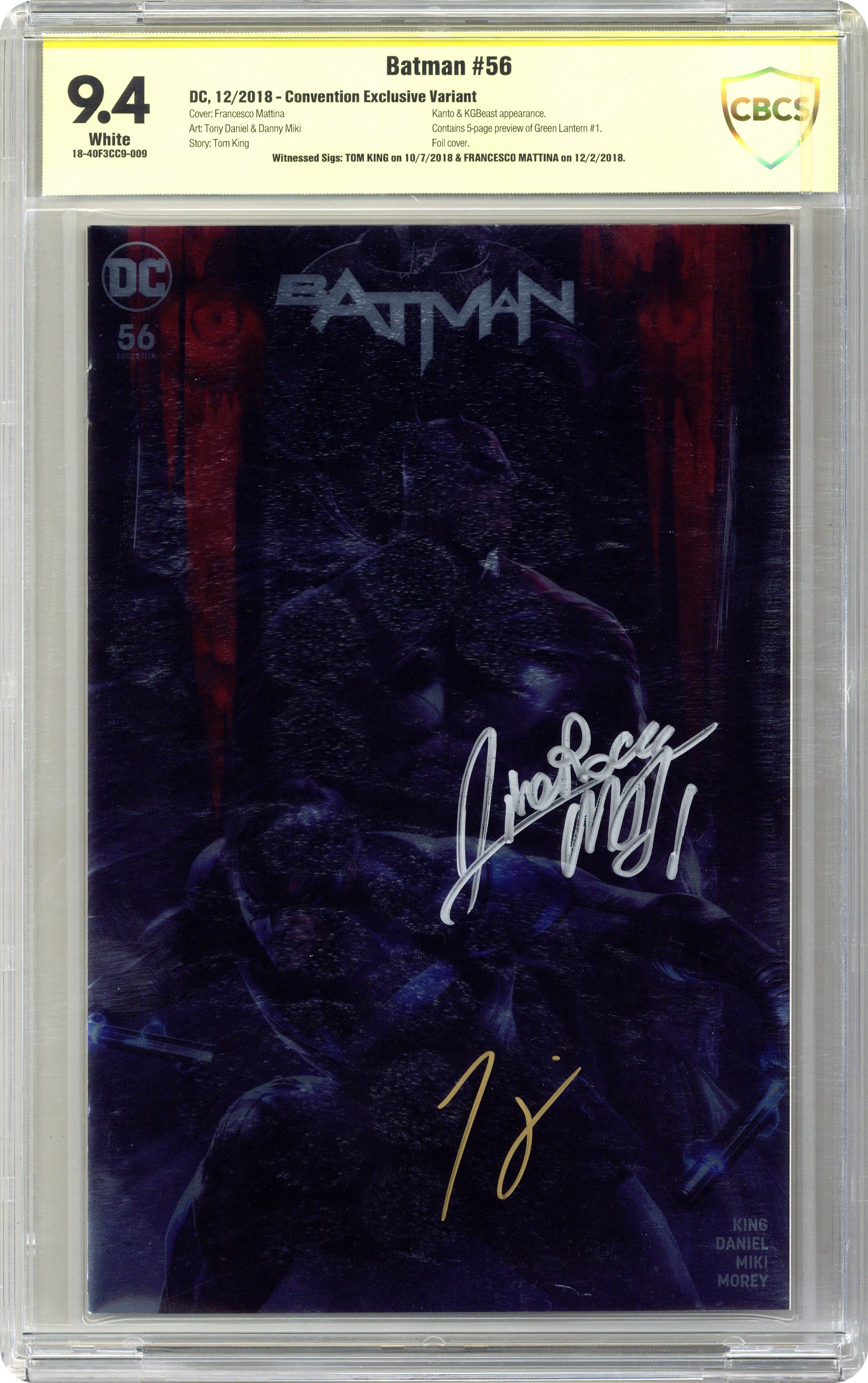 - Witnessed Sigs: Tom King on 10/7/2018 and Francesco Mattina on 12/2/2018. Convention Exclusive Variant.
