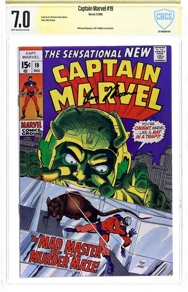 Cover pencils by Gil Kane, inks by Dan Adkins. "The Mad Master of the Murder Maze!", script by Roy Thomas and Gil Kane (plot), pencils by Gil Kane, inks by Dan Adkins; Having survived the blast that killed Yon-Rogg, Rick Jones awakens and switches to Captain Marvel so that Mar-Vell can take them the distance to New York City; There, Rick begins looking for a job and a place to live; After countless reject, Rick is offered a job and residence in the high tech building called Minos Towers; Minos Towers is run by famous a pathologist made popular by testing the psychology of rats, and has offered employment and cheap lodging for those who wish to work with him; However, Rick and Mar-Vell soon learn that Webb is using the tenants of Minos Towers as part of his next psychological experiment. 36 pgs., full color. Cover price $0.15.