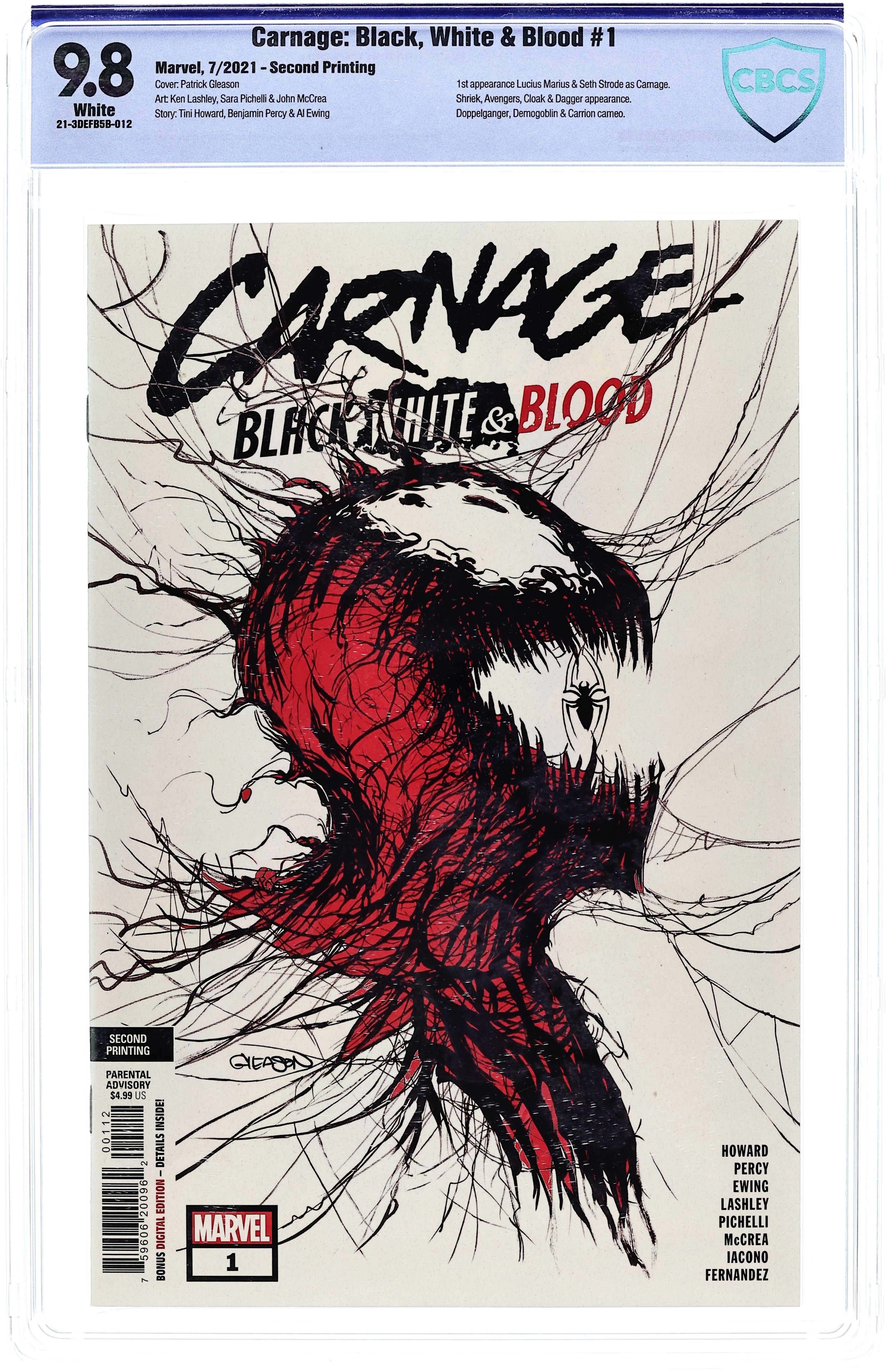 2nd Printing. Written by Al Ewing and Various. Art by Sara Pichelli. Cover by Patrick Gleason. CARNAGE RULES! Witness the cerebral chaos caused by CARNAGE, brought to life by some of the greatest creators at Marvel! But beware, True Believers, true to their titular character's namesake, these spine-chilling tales are not for the faint of heart and presented in BLACK, WHITE AND BLOOD! 36 pages, PC/B&W. Parental Advisory Cover price $4.99.