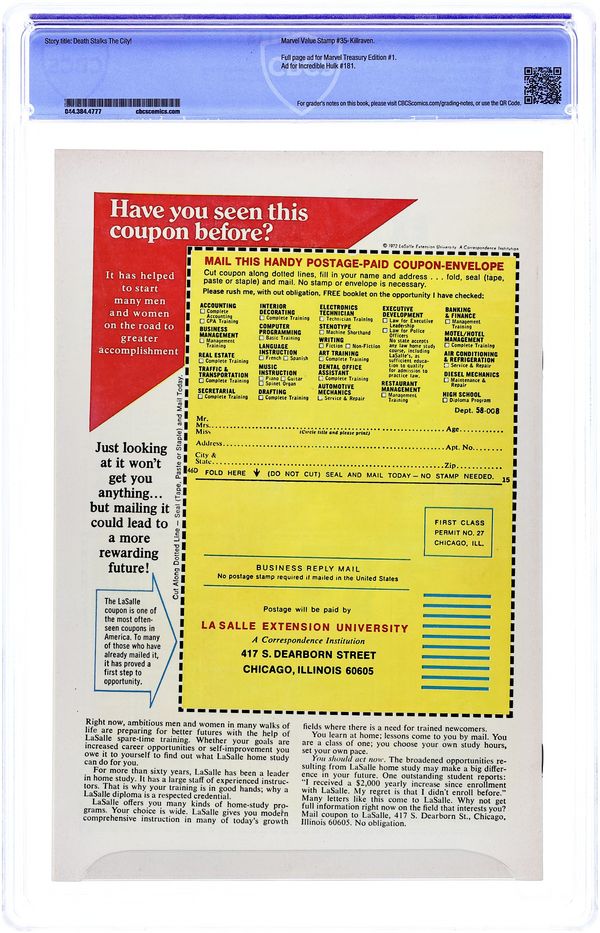 Cover pencils by Ross Andru, inks by Frank Giacoia. Death Stalks the City!, script by Steve Gerber, pencils by Bob Brown, inks by Vince Colletta; DD rescues Candice and Foggy from Death-Stalker but the villain escapes; DD combs the local chemical plants searching for Death-Stalker and, once he discovers him, ends up knocking him into a vat of hydrochloric acid; Black Widow guest appearance; cameos by the Gladiator and Man-Thing. The letters page contains Marvel Value Stamp series A #35 (Killraven by Herb Trimpe), and also an ad for Wolverine's debut in Incredible Hulk #181. 36 pgs. Cover price $0.25. Cover price $0.25.